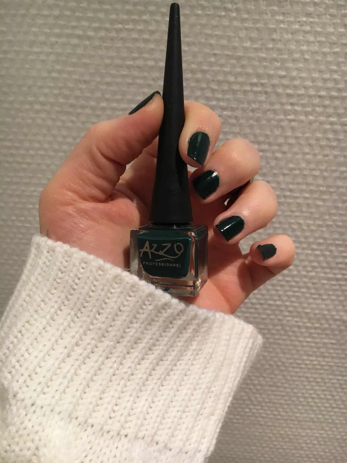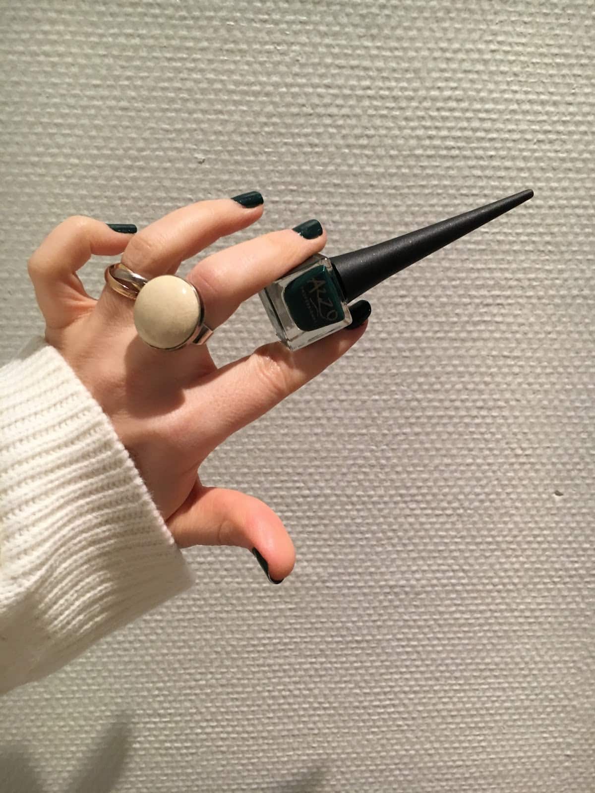 Je craque totalement pour ce vert sapin foncé qui tire sur le noir. Il sèche relativement vite et l’embout en pointe permet de l’appliquer facilement, ça change totalement des embouts courts.