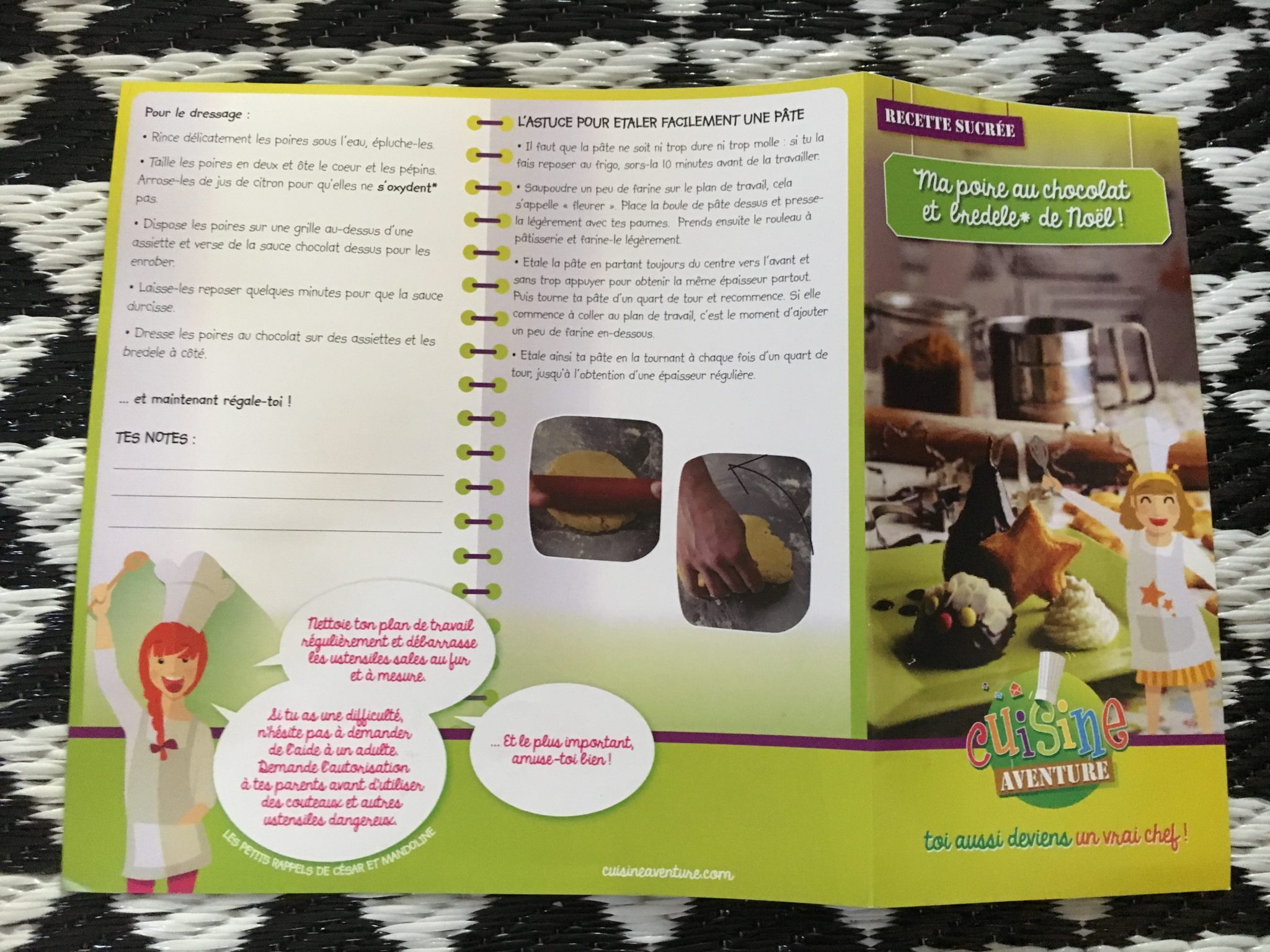 J’ai reçu cette grande enveloppe de Cuisine Aventure au surnom de ma puce » princesse tutu » . A l’intérieur, un courrier personnalisé à son prénom, des identifiants pour nous connecter sur leur site sécurisé, découvrir leur univers et des conseils . Dans l’enveloppe il y’avait également, des ustensiles pour réaliser un trousseau. Nous avons eu deux emportes pièces pour réaliser des sablés, deux recettes de saison, réalisables par des enfants et un sachet d’épices.