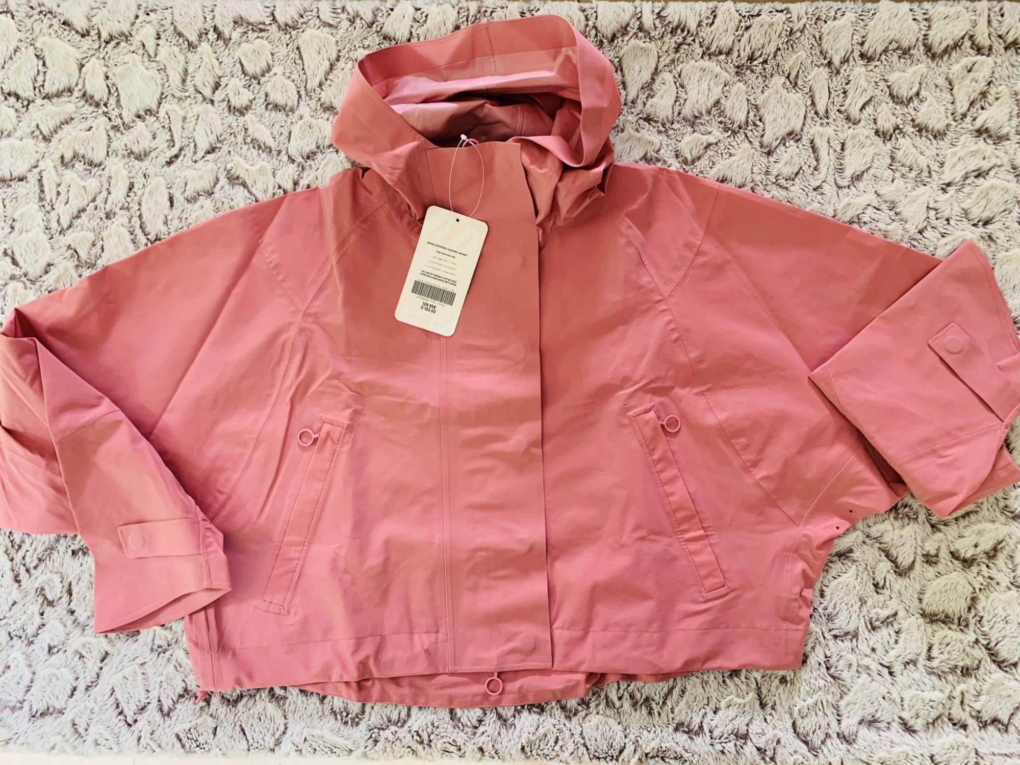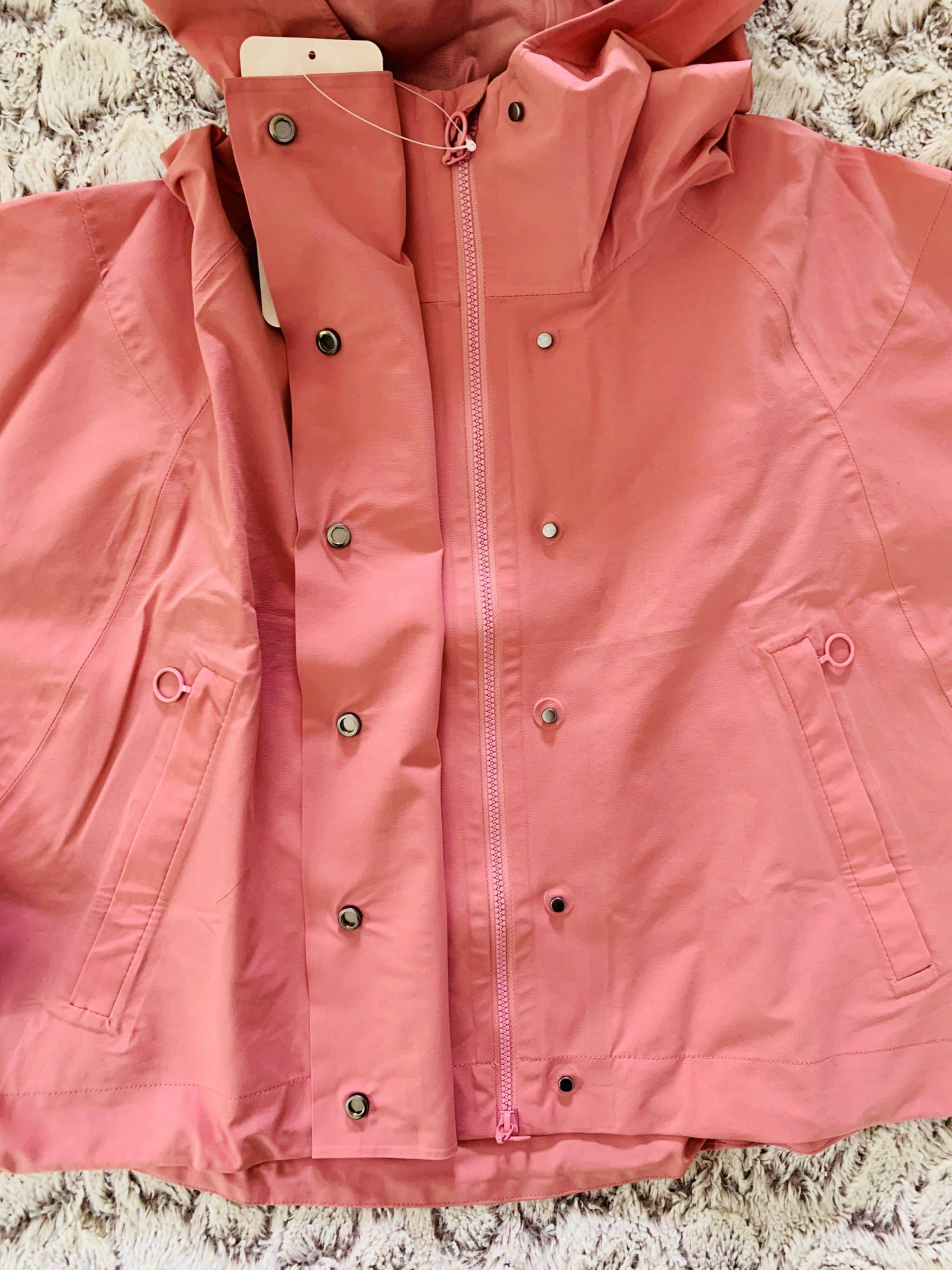 Enfin, je reviens sur cette adorable veste, c’est une coupe féminine, courte, aérienne, pratique pour se dépenser ou des activités en extérieur. Sa matière est ultra respirante. J’adore ses finitions, des boutons pressions, un cintrage de la taille. Ultra pratique avec ses poches et sa capuche. Elle existe en rose et en vert, je la recommande !! je l’ai prise en taille M, je préfère surtailler mes vestes.