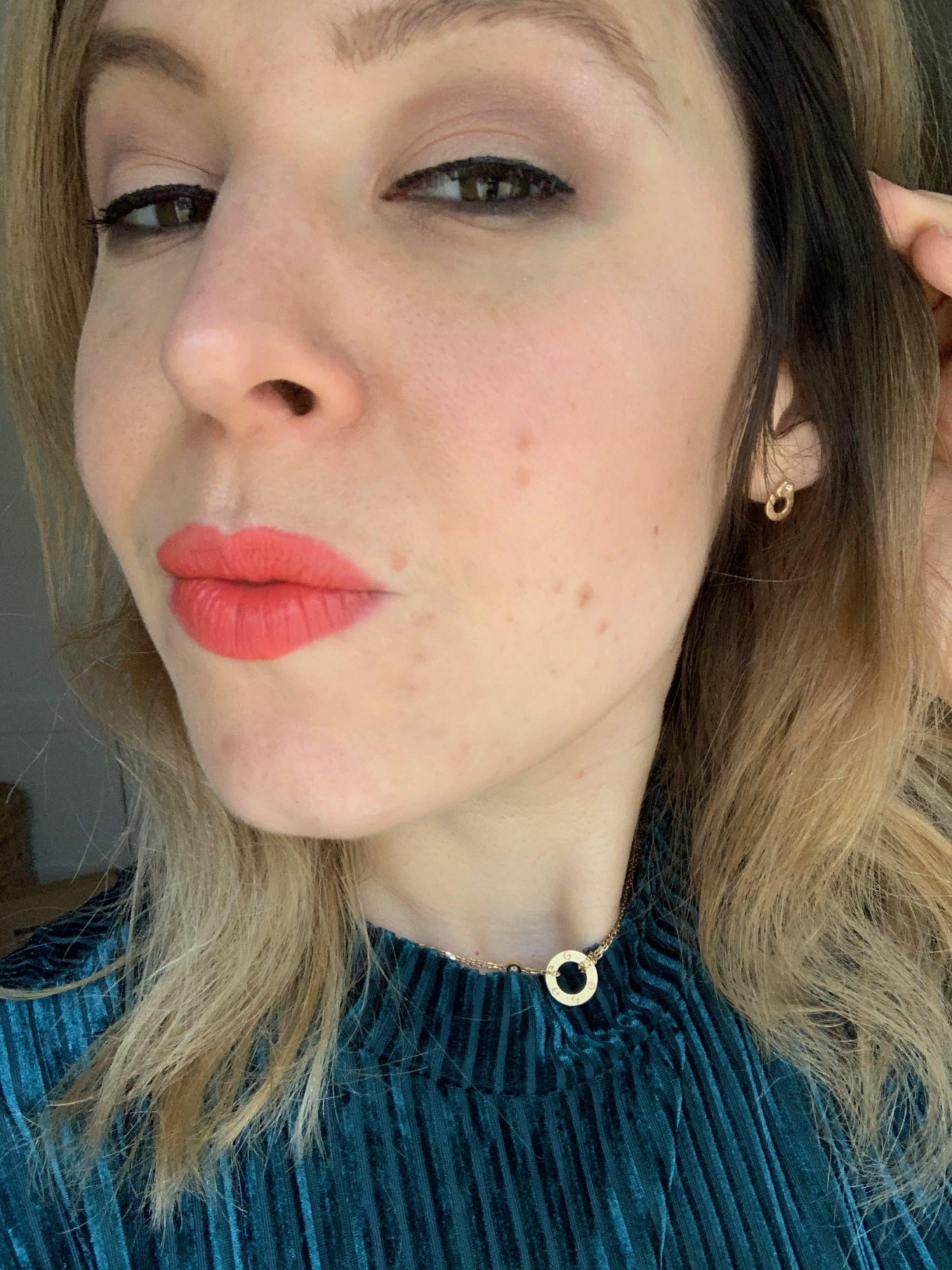 Enfin mon rouge à lèvres, d’ailleurs je ne suis pas toujours hyper parfaite, je déborde légèrement mais ce n’est pas grave . Mes préférés sont ceux à 3 euros, j’en ai plusieurs, ici Firel , j’adore aussi Peach et Cantaloupe. Ils sont hydratants, les rouges à lèvre semi mat You are cosmetics tiennent bien et la couleur est pigmentée comme j’aime, vibrant, chic.