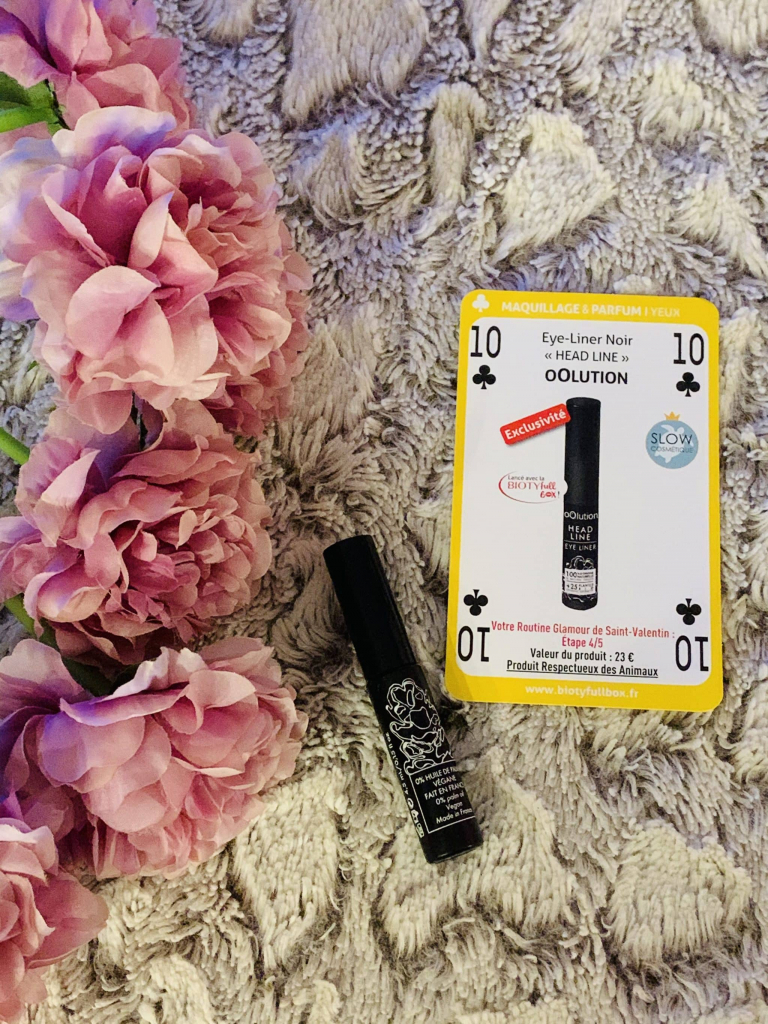 On ne présente plus Oolution, plusieurs mois et découvertes à travers différents soins de qualité. Ce mois-ci la box nous offre deux maquillages de qualité dont ce liner. Le noir est bien opaque, la pointe précise et facile à utiliser. A l’intérieur, on y trouve de l’eau de myrtille, de l’extrait de marron d’Inde, de l’extrait de racine de guimauve. Nous profitons des vertus antioxydants, protectrices, tonifiantes, lissantes, apaisantes.