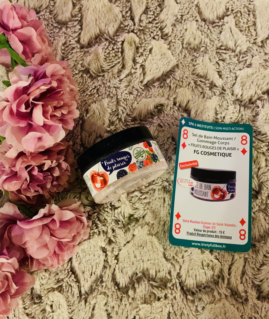 Troisièmement, ça sent bon les fruits rouges, ça mousse, un bain plaisir et gourmand. Vous n’avez pas de baignoire, vous pouvez l’appliquer dans le creux de votre main en gommage. Un soin délicieux, ludique et totalement Saint Valentin !