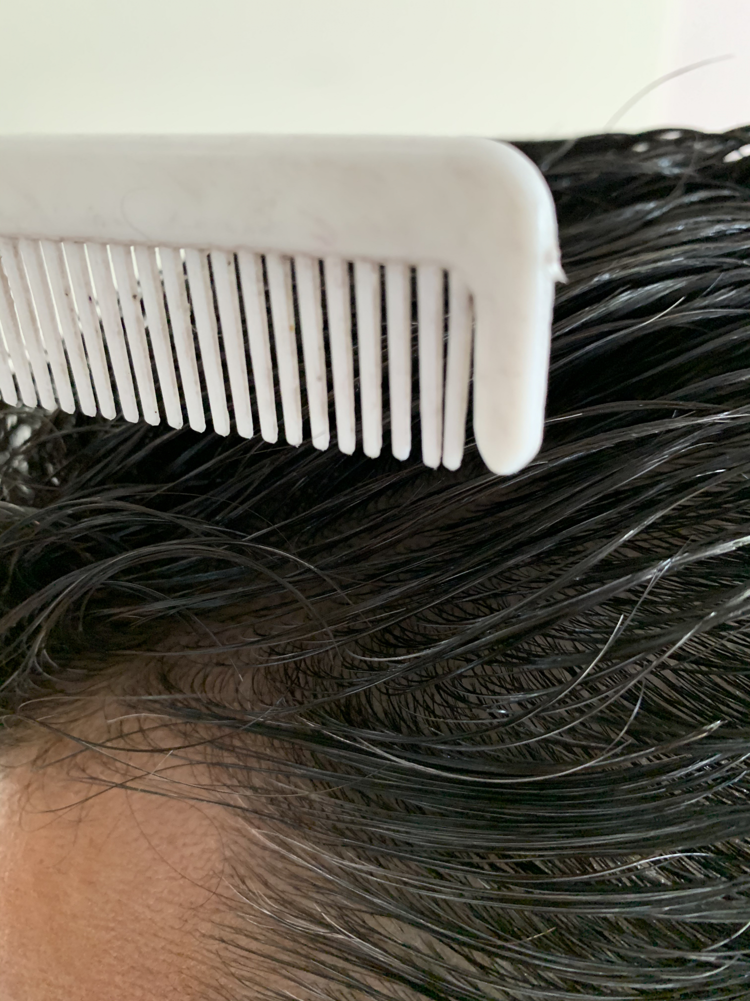 Premièrement, mouillez vos cheveux, vous les essorez correctement afin de ne pas avoir d’eau. Aucun mélange, le gel s’applique facilement avec des gants, ça ne coule pas, ça ne sent pas mauvais. Je vous recommande mon astuce de la brosse à dents pour bien insister sur les zones blanches.