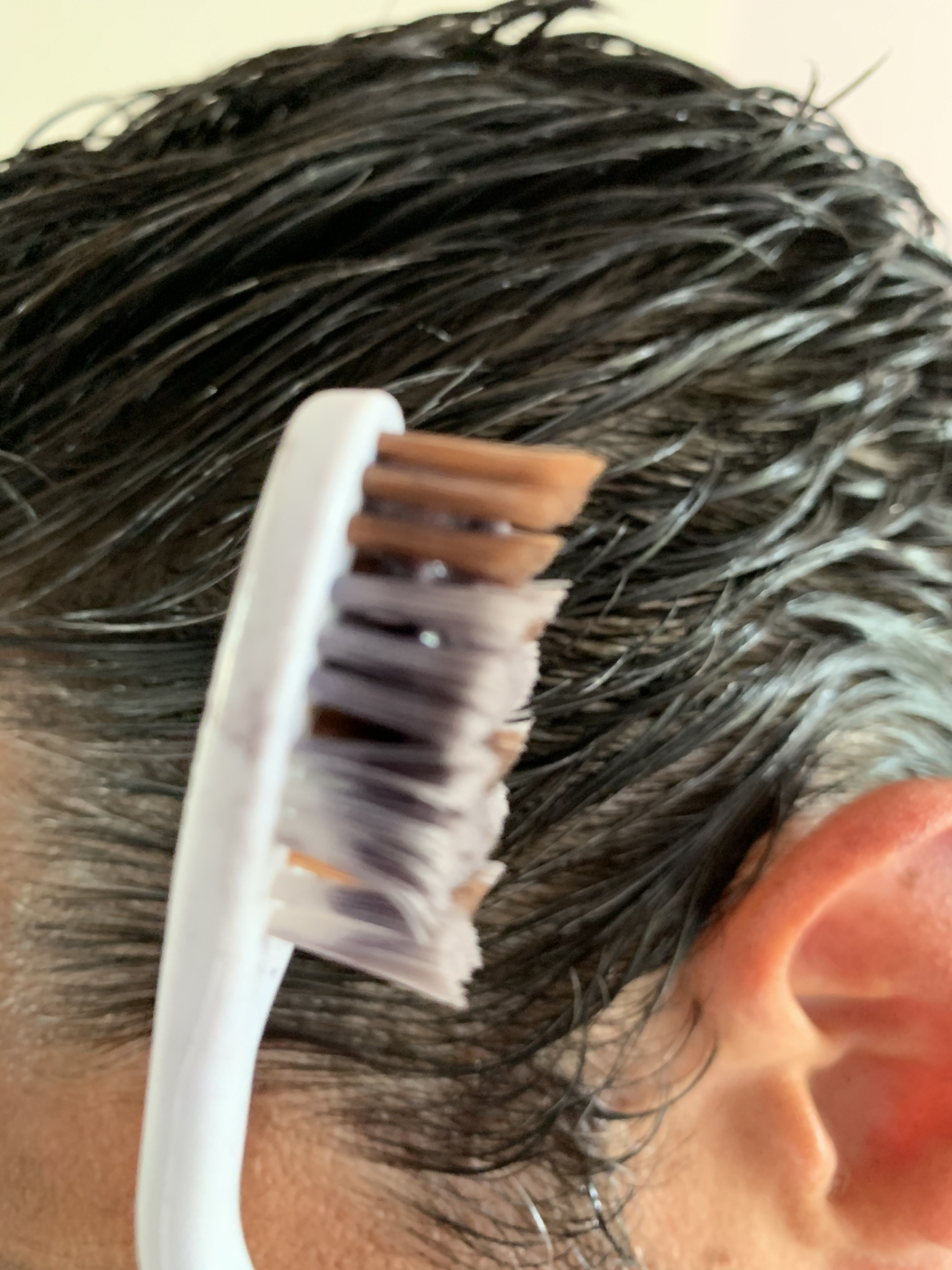 Afin d’être précis, je vous recommande d’appliquer le soin repigmentant pour cheveux blancs avec une petite brosse à dents sur les zones délicates comme les tempes afin d’attraper tous vos cheveux blancs.