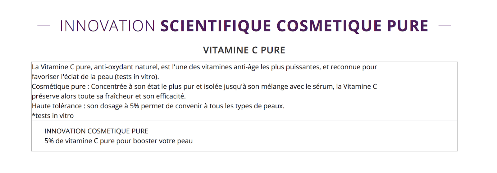 J’ai été ravie de découvrir une innovation, un booster d’éclat qui fonctionne et que j’apprécie en sérum sur ma peau. Je ne connaissais pas les bienfaits de la vitamine C en cosmétologie .