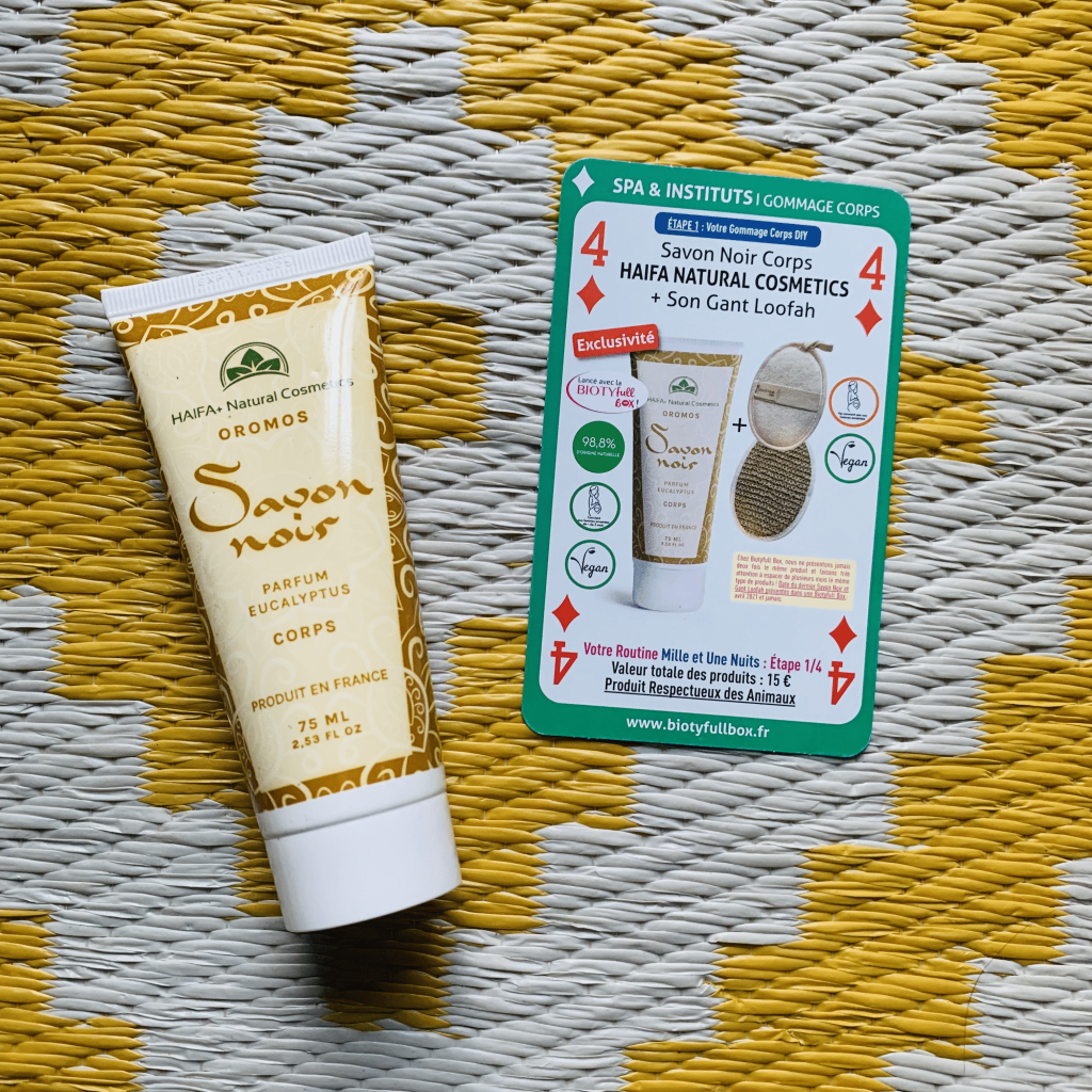 Etape 1, le savon noir corps Haifa natural cosmetics et son gant Loofah