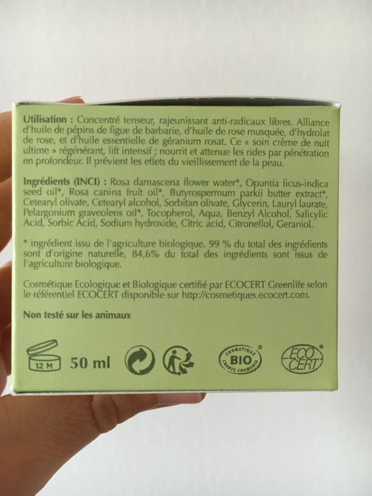 Cette crème de nuit est bio à 84/100 et elle est non testée sur les animaux.