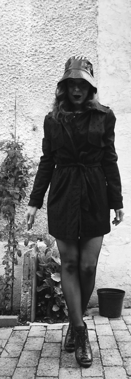 Digne d’une héroïne d’un polar noir, je m’amuse de la pluie en trench et bob vernis.