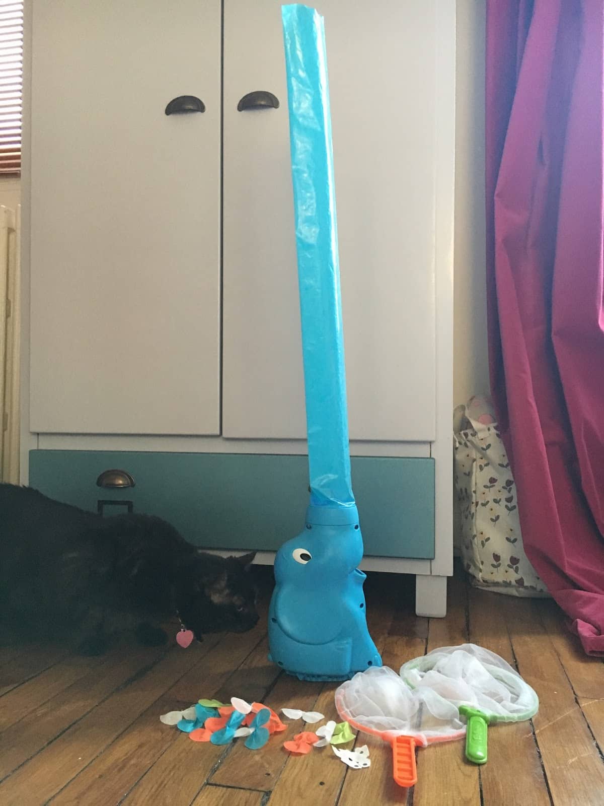 C’est un éléphant qui souffle des papillons, qu’il vous faut attraper avec une épuisette, un filet.