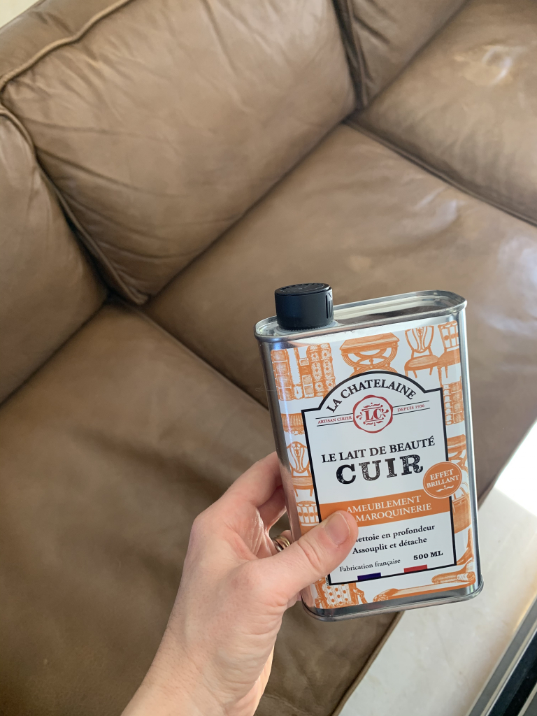 Premièrement, je vous présente la Chatelaine lait de beauté pour le cuir, il est parfait pour mon canapé qui supporte toutes les agressions des enfants, plateaux télé, apéro et animaux. Franchement, j’ai honte parfois du traitement que nous lui infligeons.