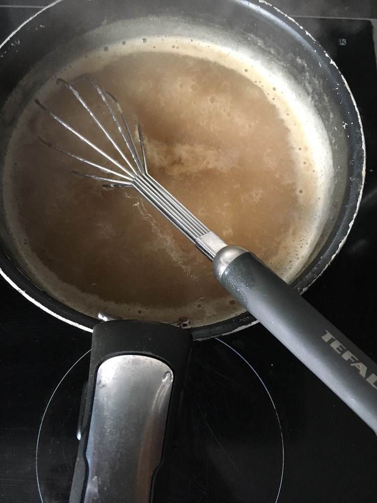 Je porte a ébullition et j’ajoute 3 cuillères à café d’agar agar pour gélifier ma compote . 500 ml = 1 cuillère à café . Il faut que ça soit chaud, bouillant pour que ça se gélifie correctement, je laisse généralement 5 minutes et je mélange bien au fouet pour éviter les grumeaux .
