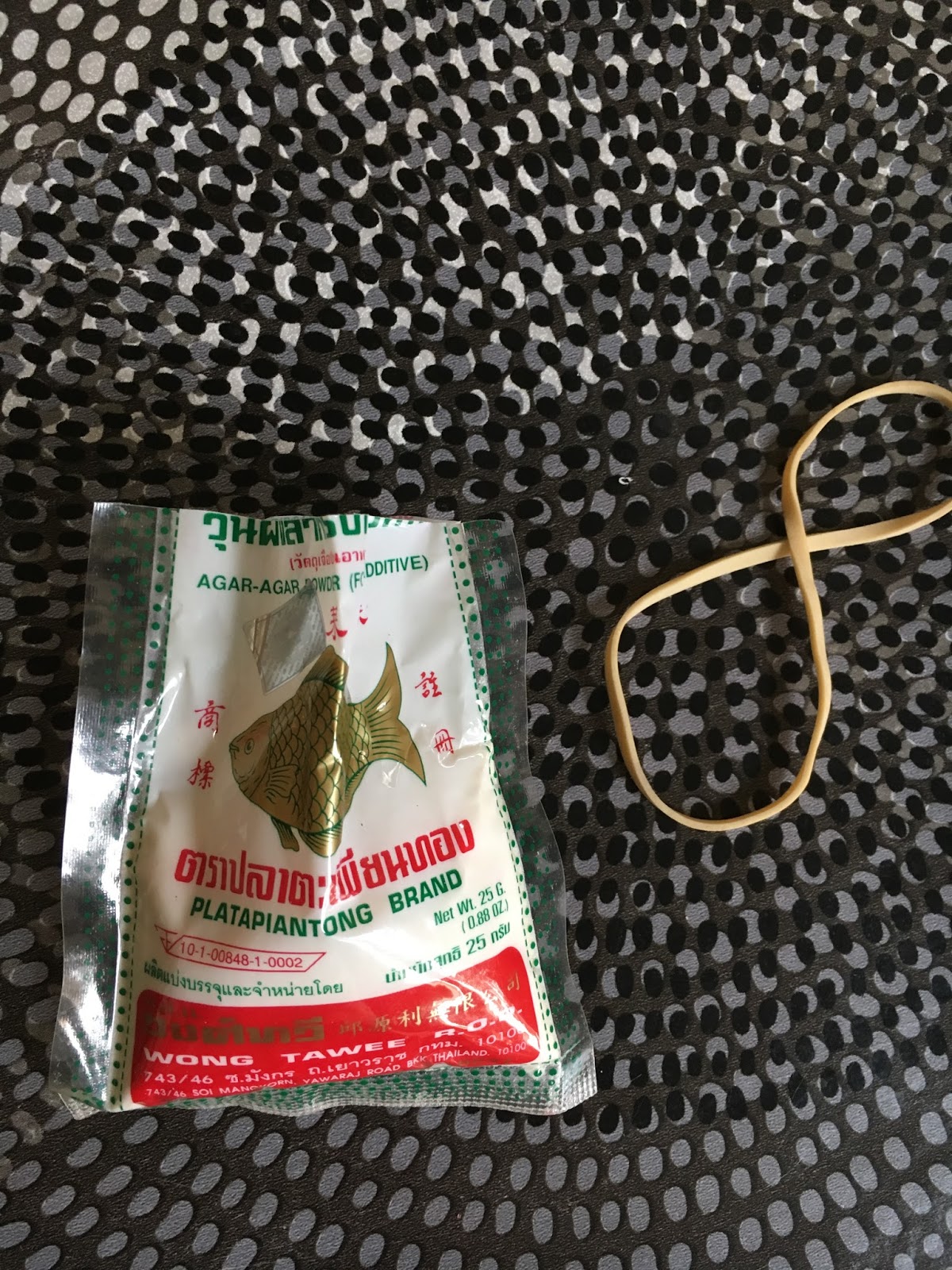 J’ai rapporté mon agar agar d’asie, j’ai fait mes réserves car j’en utilise beaucoup, c’est une algue très interessante. Vous en trouverez sur internet mais aussi en boutique bio et grande surface. Mieux que la gélatine bovine, je ne suis pas fan d’ailleurs, dommage que les bonbons ne soient pas fabriqué à l’agar agar .