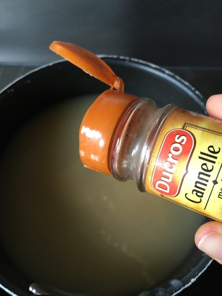 J’ajoute une grosse cuillère de cannelle car j’adore ça ( pas obligatoire) et un peu d’Hermestat liquide ( deux cuillères ) pour sucré. C’est du faux sucre pour rester dans le principe de « light » je m’en sers de temps en temps, c’est pratique .