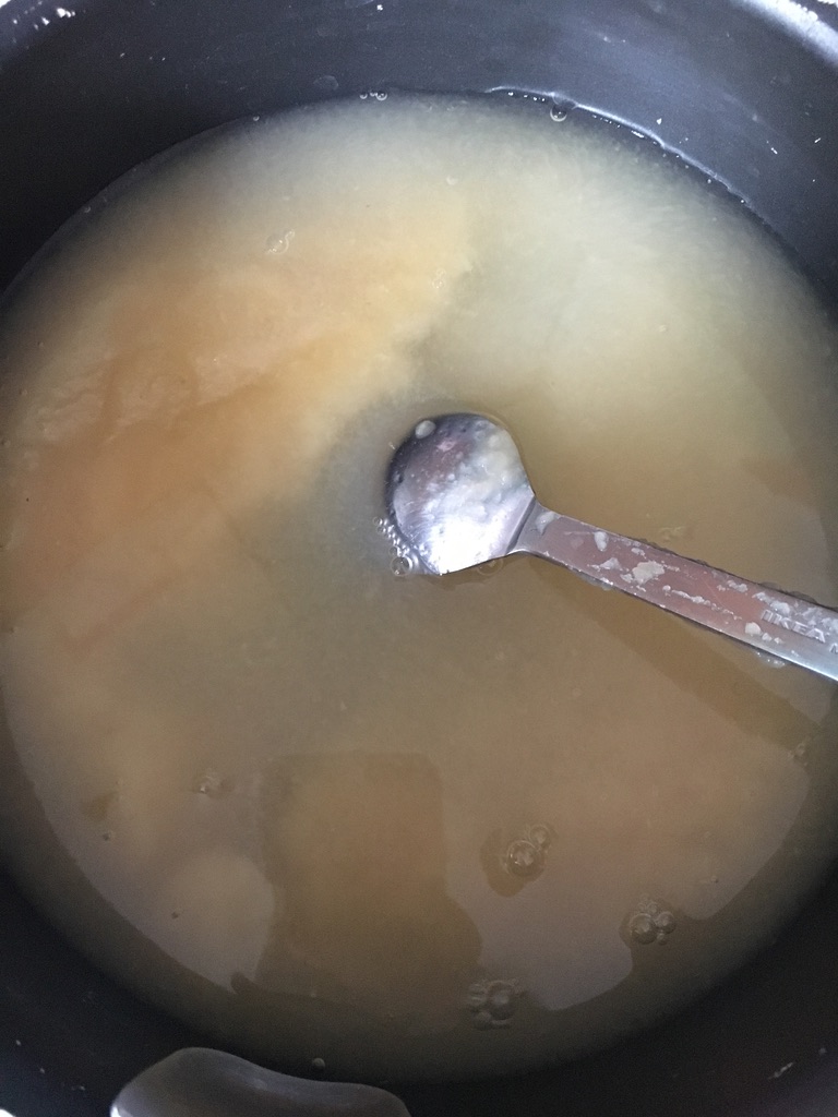 Je verse la compote dans une casserole et je mets la même quantité d’eau ce qui me fait 1500 ml en liquide, c’est important de connaitre la quantité d’eau pour bien d’oser l’agar agar et avoir une belle consistance .