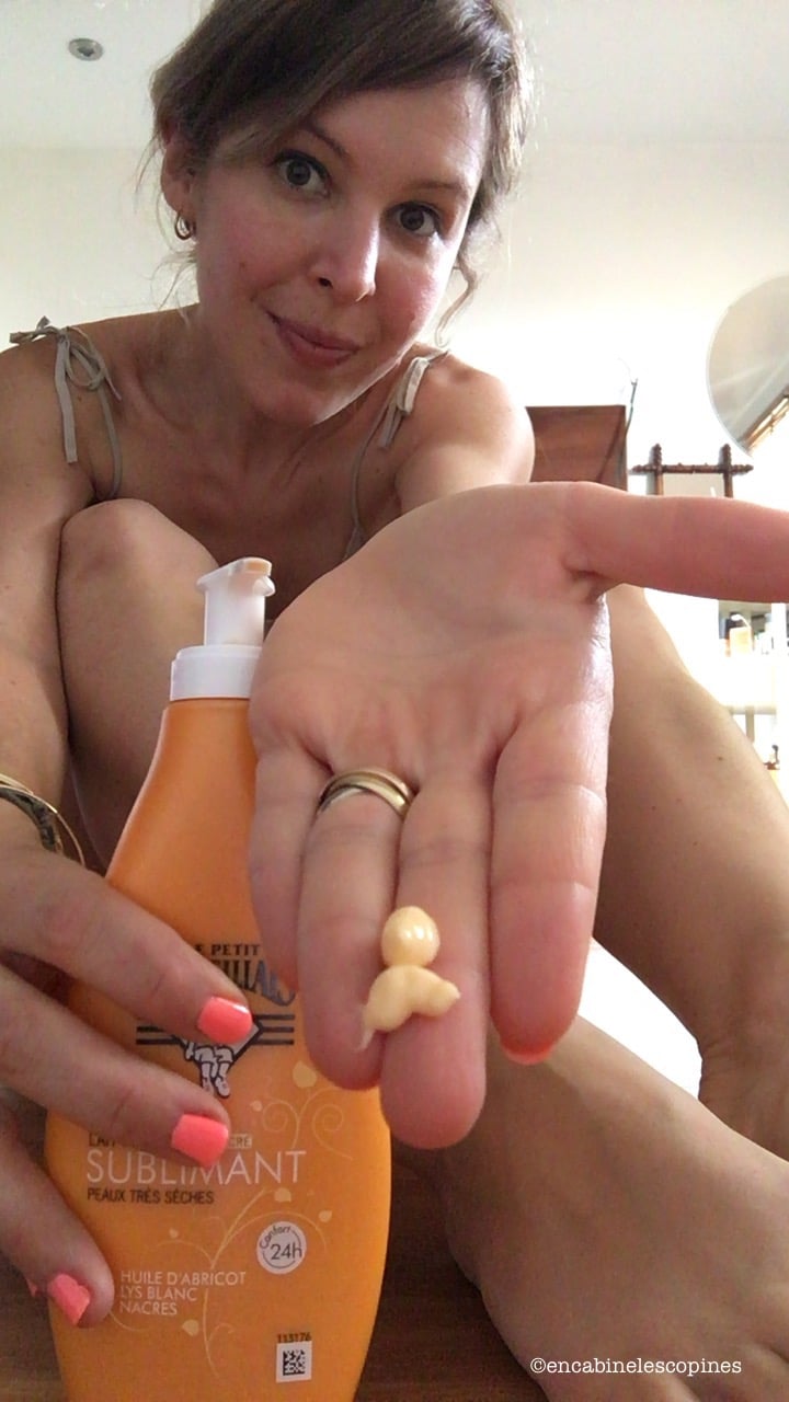 J’adore me tartiner après mon bain, ça sent bon, c’est agréable, il laisse une délicate odeur sur moi et un joli reflet nacré qui est une touche de coquetterie que j’apprécie quand on est légèrement vêtu.