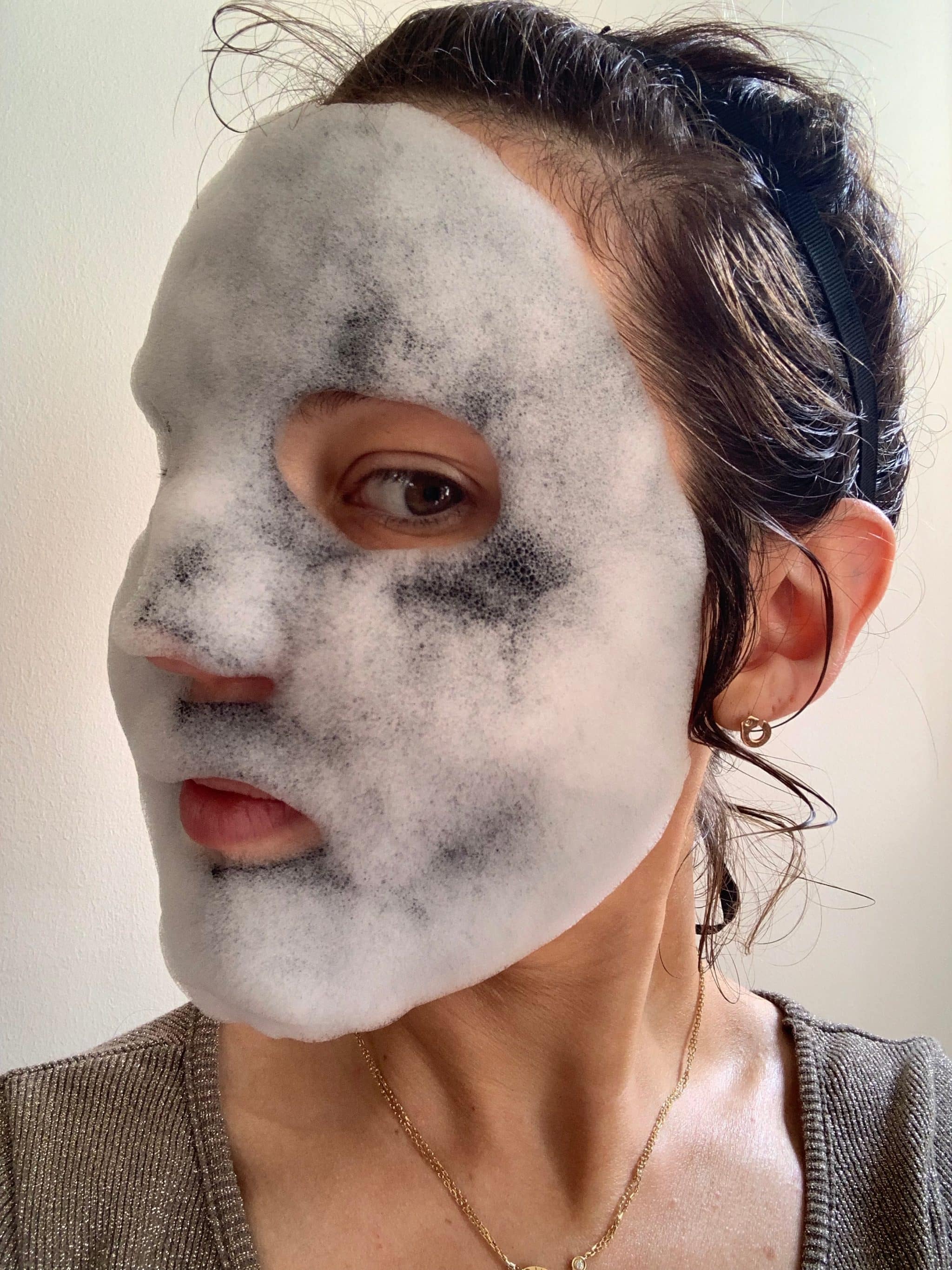 C’est un masque tissus recouvert d’actifs ( acides de fruit) qui se met à mousser . Le soin est décrit comme capteur d’impuretés charbon et pulpe de cellulose. Pendant les 10 minutes, on passe un agréable moment de détente, le masque tient bien en place.