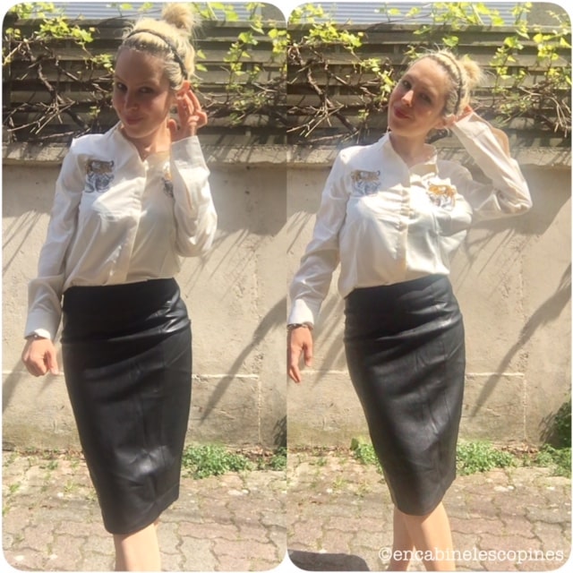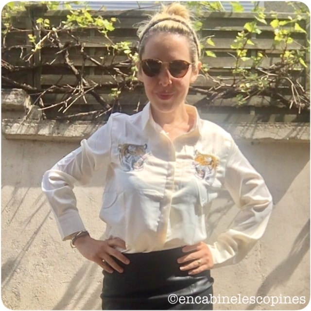 Je commence avec mon chemisier et ses deux tigres, son prix 23 euros. Je l’ai pris en taille M.