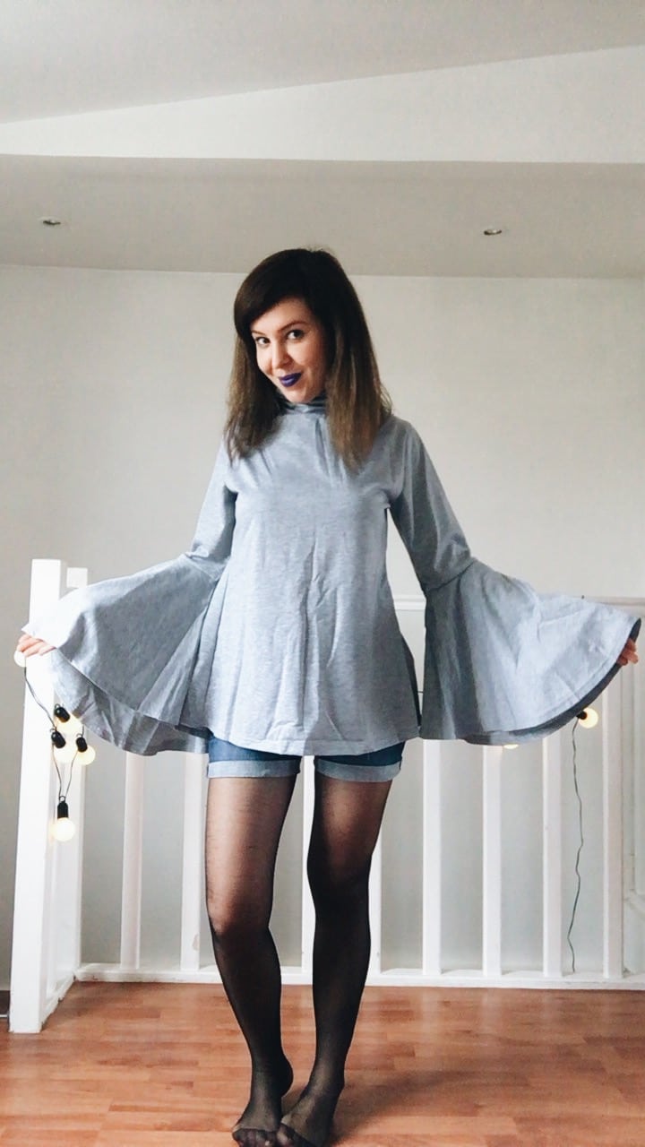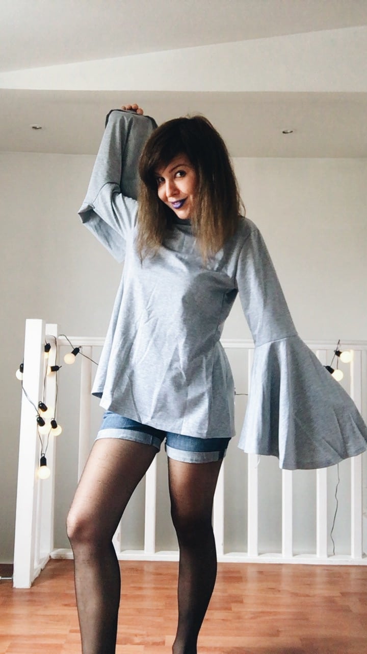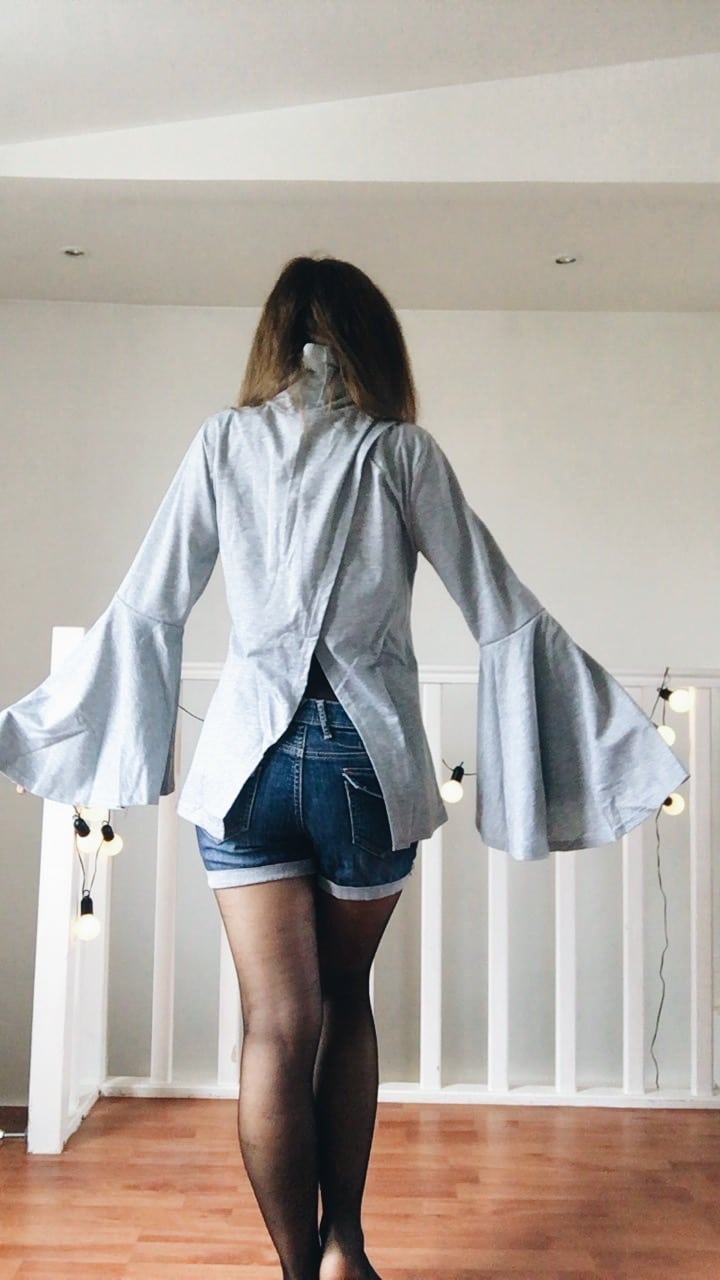 Je continue avec ce sweat aux manches longues et évasées, gris romantique et ouvert dans le dos.