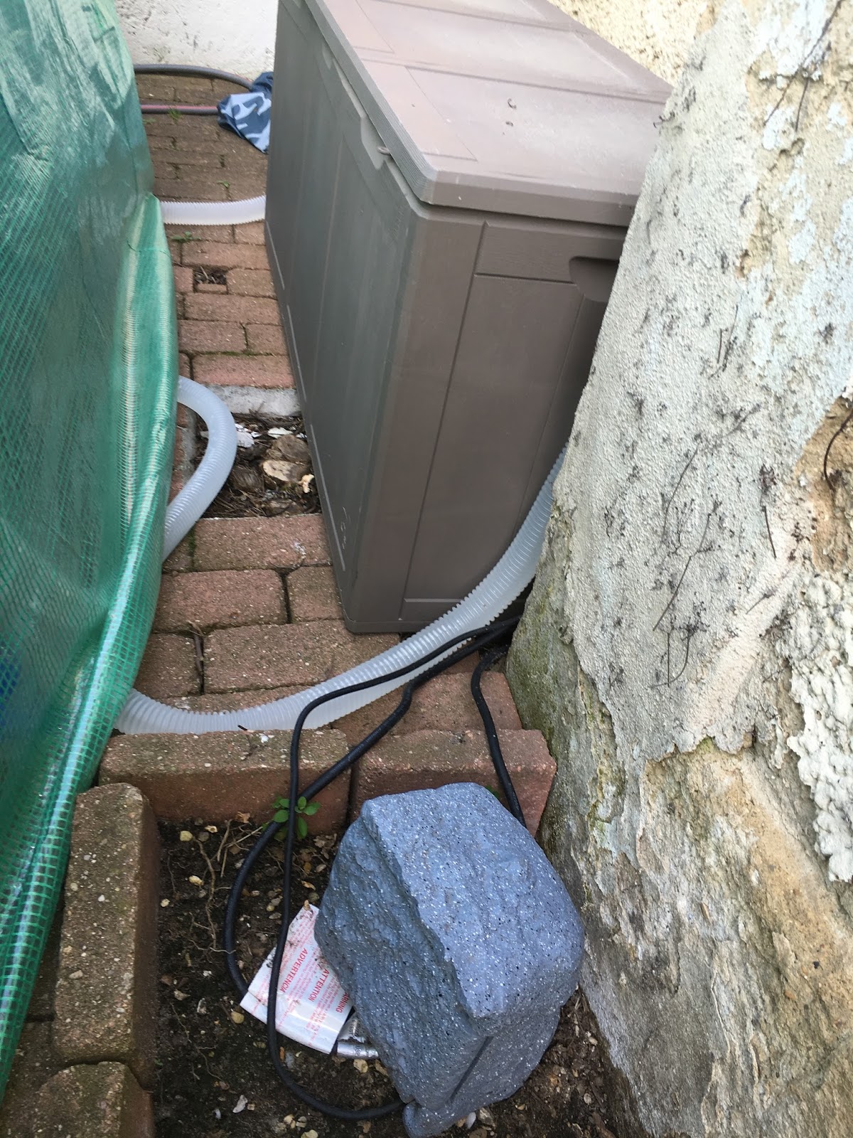 Nous ne savions pas si ce système de serre serait efficace sur la température alors nous avions prévu une solution pour les jours sans soleil en achetant un mini chauffage. Dans ce coffre nous y stockons la pompe et un mini chauffage d’appoint (ici) pour booster la température de l’eau si besoin . Je l’ai programmé sur les heures creuses .