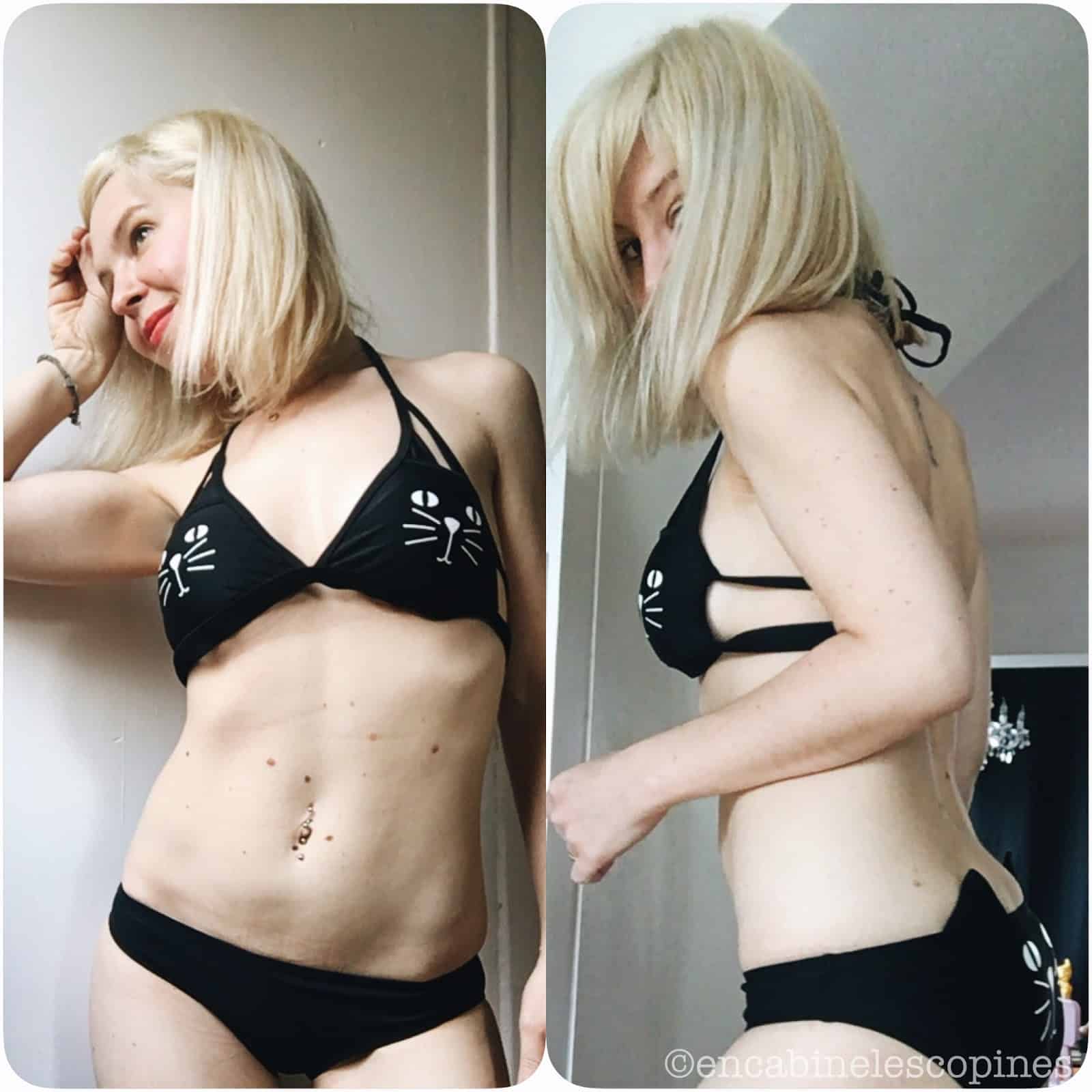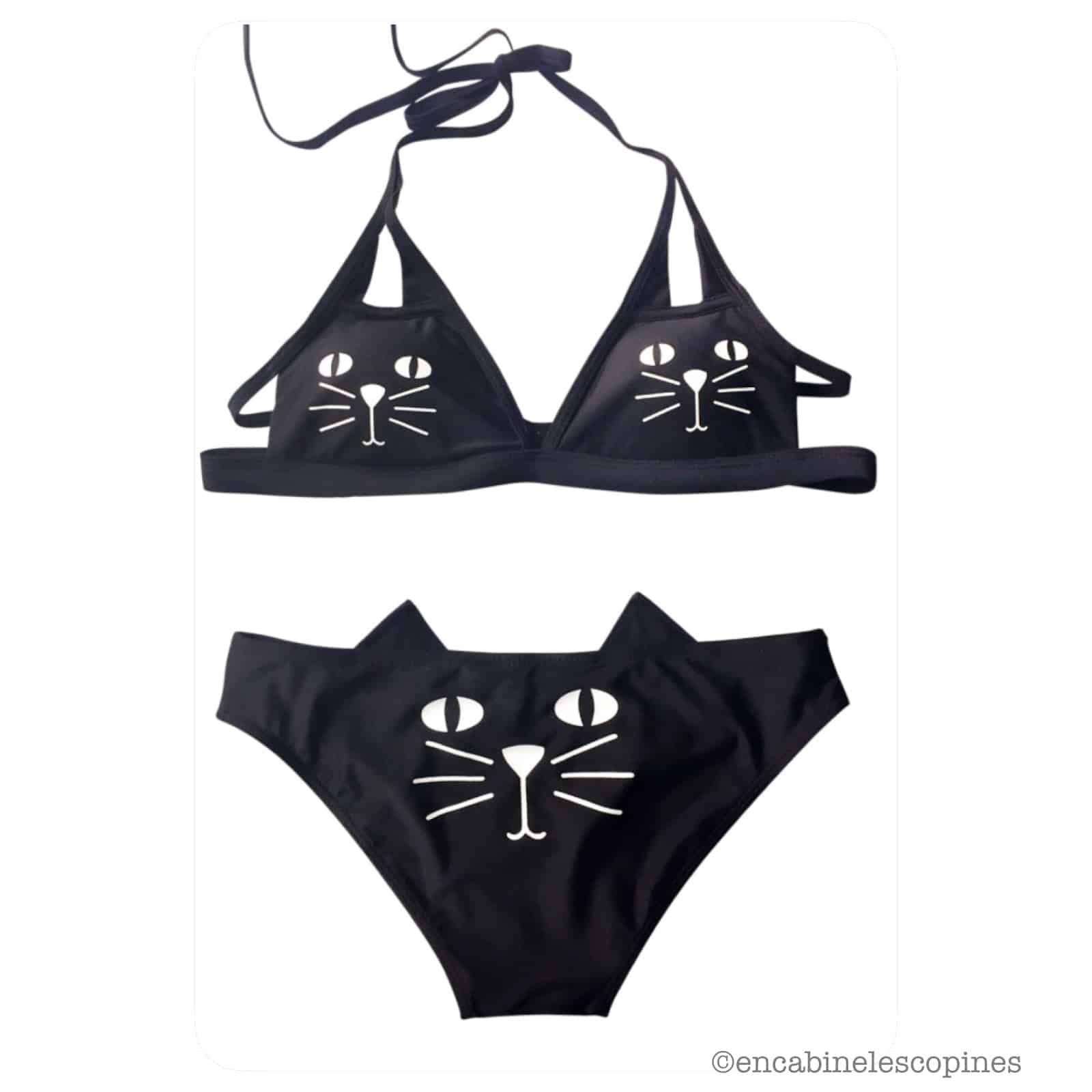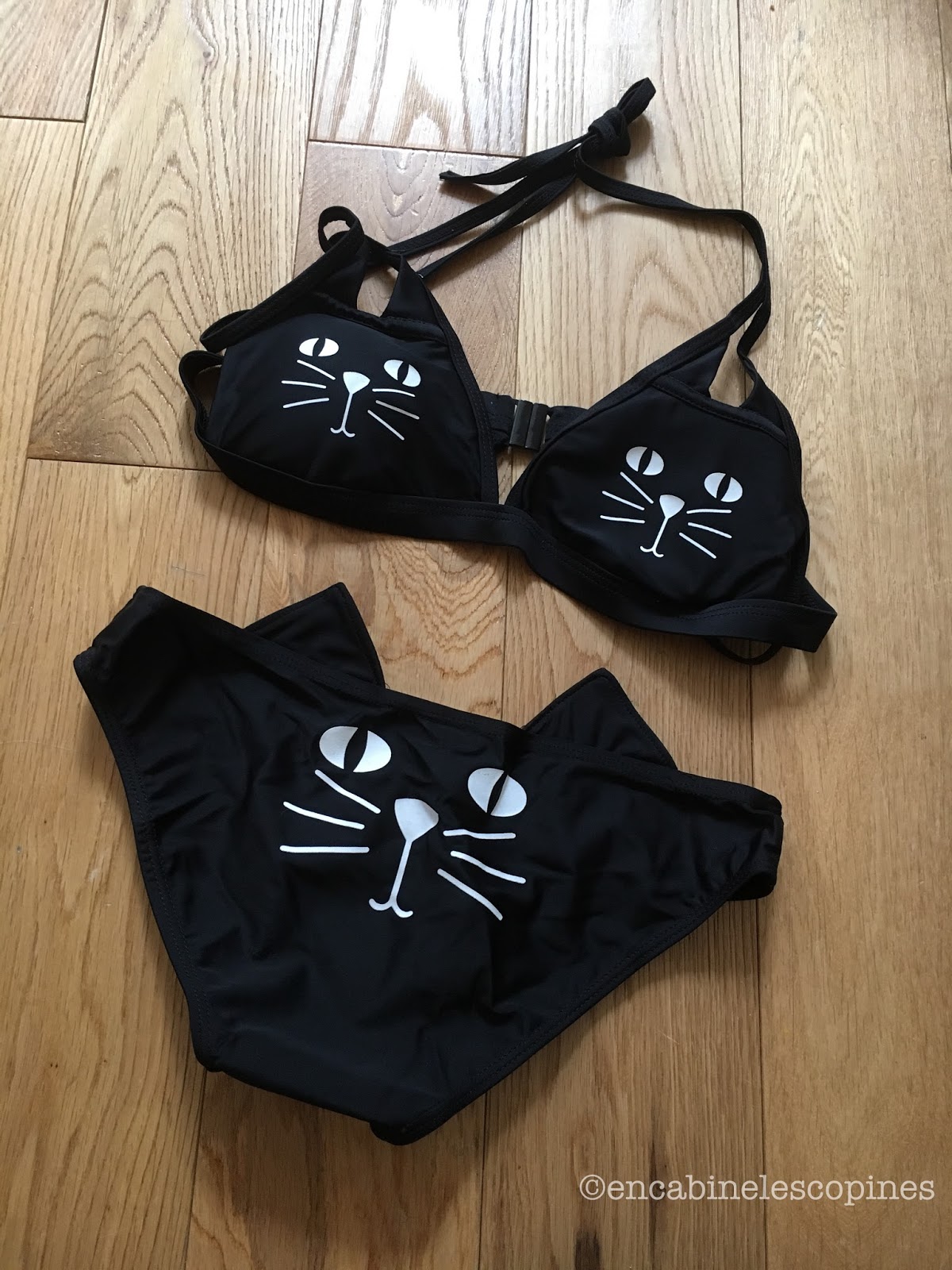 La culotte tombe bien j’adore le gros chat sur les fesses avec ses oreilles qui accompagnent mes courbes et le haut du maillot de bain est adorable.