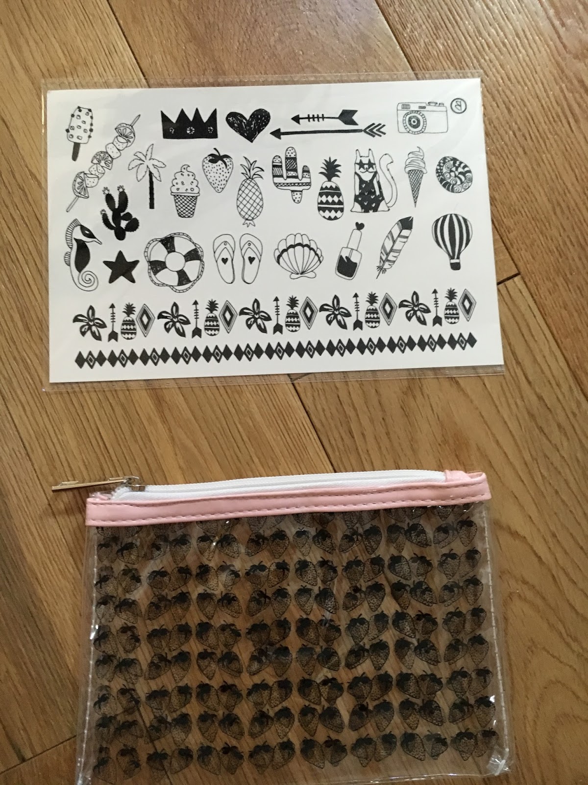 Enfin je vous parle de mes deux chouchous, la mini trousse de toilette » fraises » et la planche de tatouages éphémères .