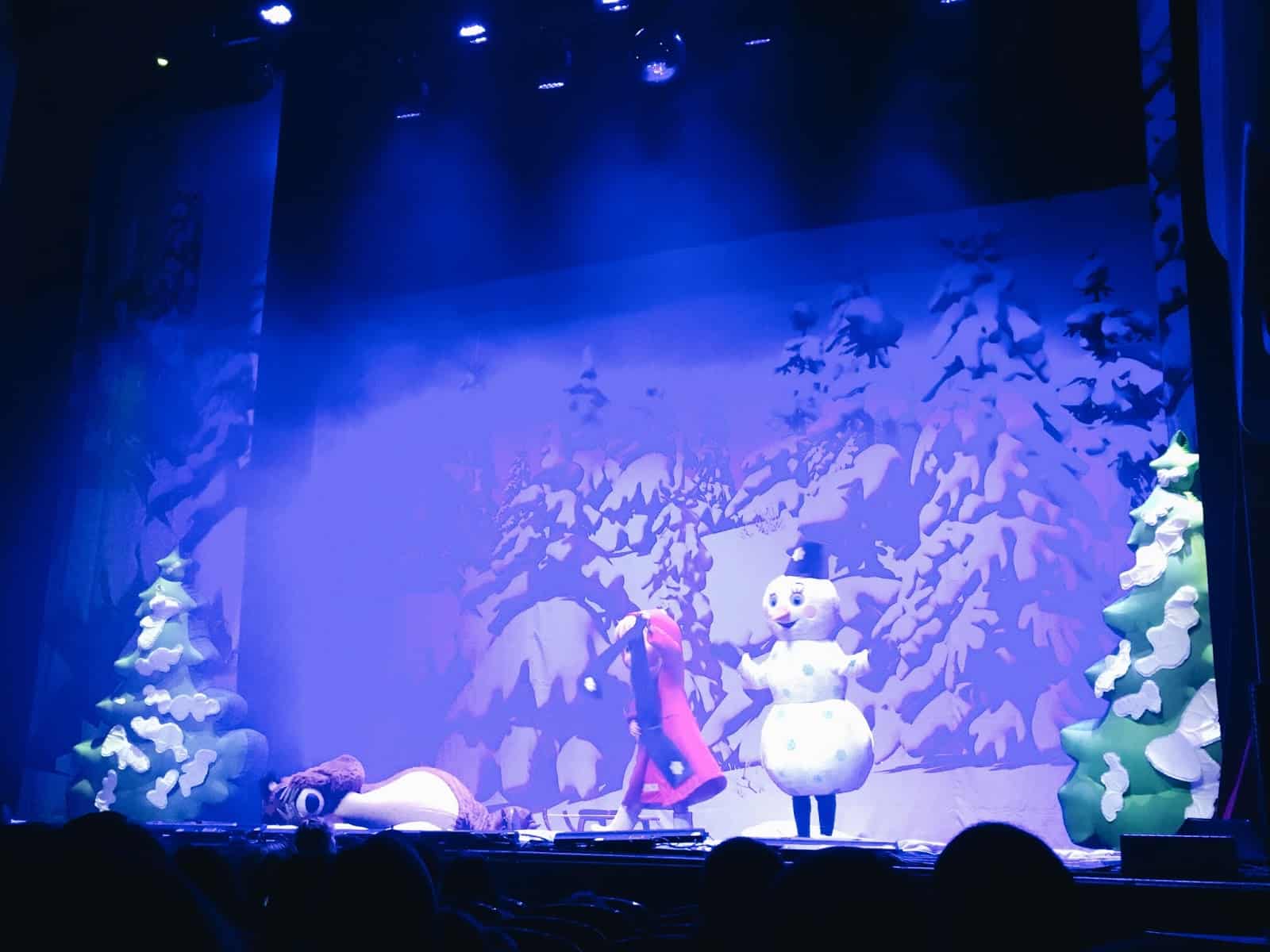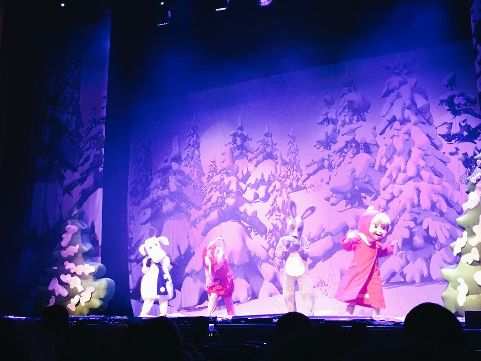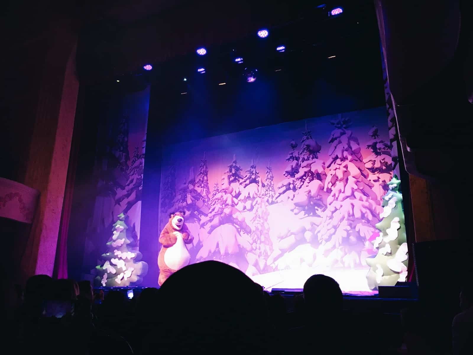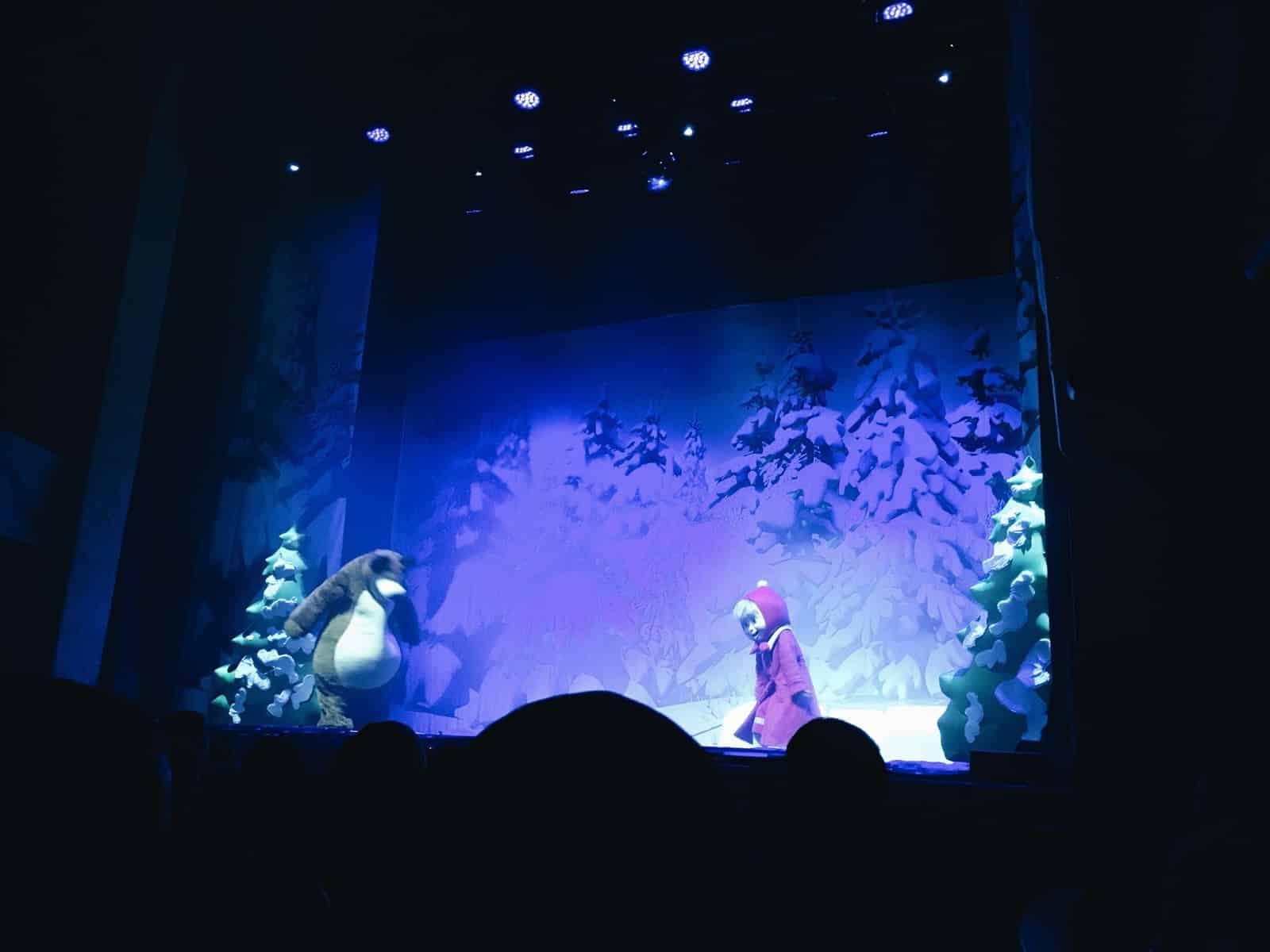 Les décors sont sobres mais jolis, les costumes sont fidèles au dessin animé comme les voix des personnages et les musiques. Ils ont bien repris les chansons que l’on connait bien et tout le monde chante, danse . On a vraiment le sentiment d’être au coeur d’un épisode, d’être avec Masha et Michka.