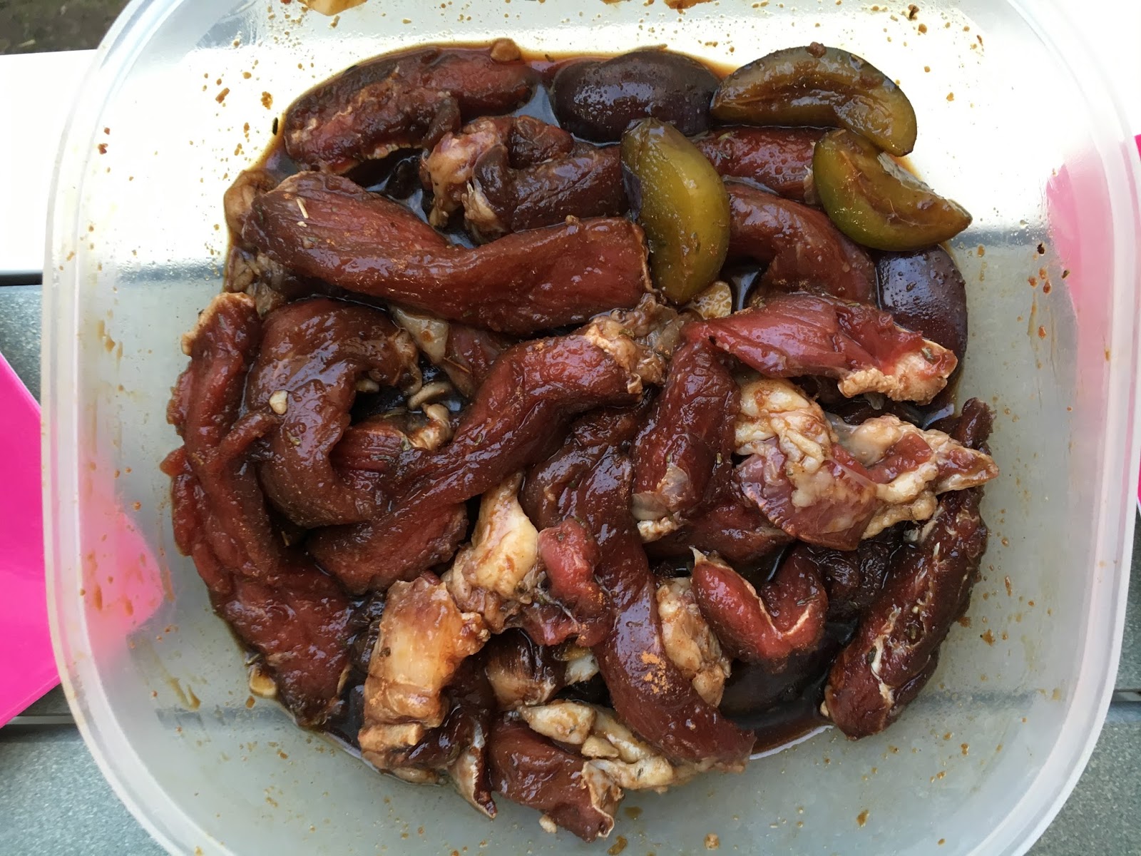 Je fais mariner de la viande de boeuf que j’ai coupé en lamelles dans du miel, du soja salé, du soja sucré, du thym, de l’ail ( beaucoup d’ail) , de la cannelle et je mets des prunes ( ou autres fruits de saison ) .