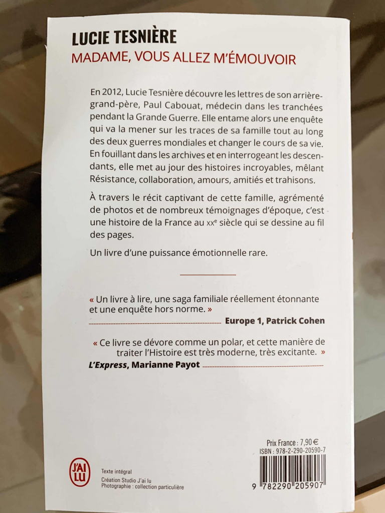 Je ne veux pas trop vous en dire mais l’idée est géniale, c’est un roman, une saga, une enquête prenante et passionnante. Ce roman est une enquête de Lucie Tesniere l’écrivain, des lettres de son arrière grand père découvertes chez sa grand-mère. Il était médecin dans les tranchées . C’est à la fois romanesque et on y trouve des documents d’époques, des archives administratives, judiciaires. Par ailleurs, j ’ai une passion pour la seconde guerre mondiale, les récits sur cette période. Ma grande-mère nous parlait beaucoup de son passé et elle nous montrait les reportages à la télévision en noir et blanc. A travers ce livre, j’y retrouve « un passé » sur la guerre, je me suis sentie concernée, je recommande ce livre .
