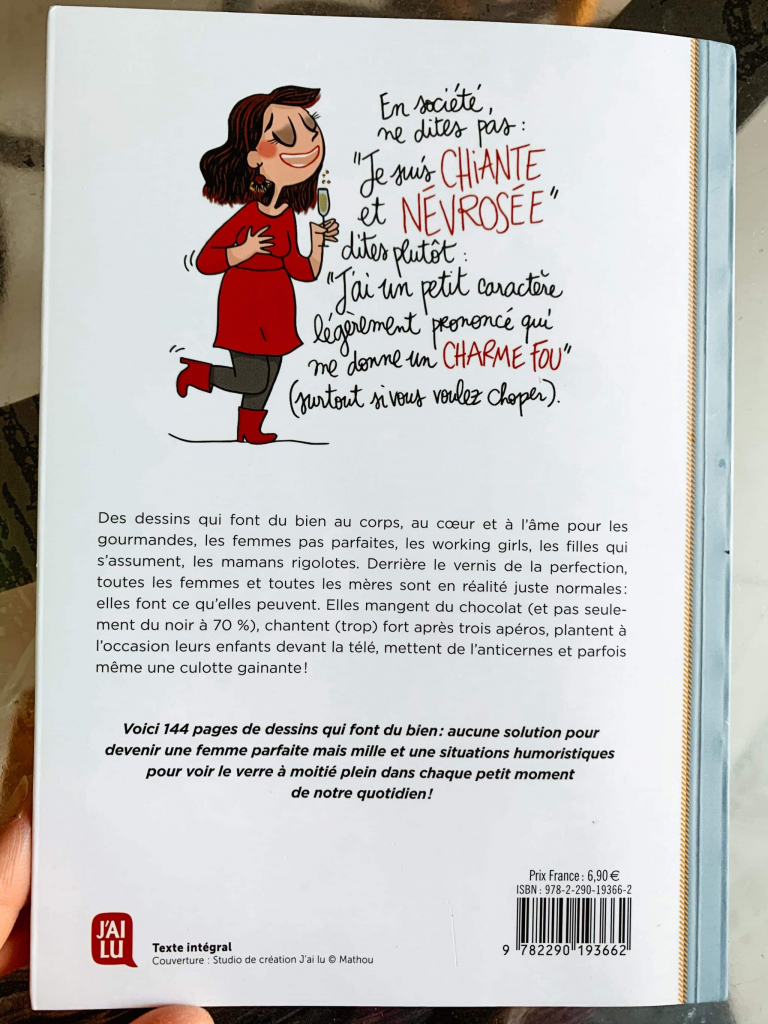 Une bande dessinée pleine d’humour avec des jolis dessins qui reprennent des moments de vie, le quotidien des femmes. Une ligne directrice déculpabilisante, on assume qu’il n’y ait aucune solution pour devenir la femme parfaite. On y trouve 144 pages qui font du bien, sous un angle plein d’humour, notre société et notre quotidien . En lisant cet ouvrage, on s’y retrouve, j’y ai trouvé de nombreux moments déjà vécus et ça m’a fait sourire.