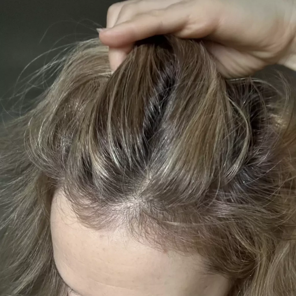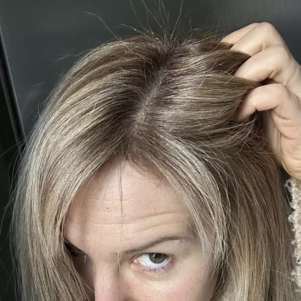 Tout d’abord, j’ai choisi la nuance blond clair n°8, idéale pour fondre mes cheveux blancs sans créer de démarcation trop marquée. Mon objectif était simple : une couverture totale, un rendu naturel et surtout un maximum de confort pour mon cuir chevelu.