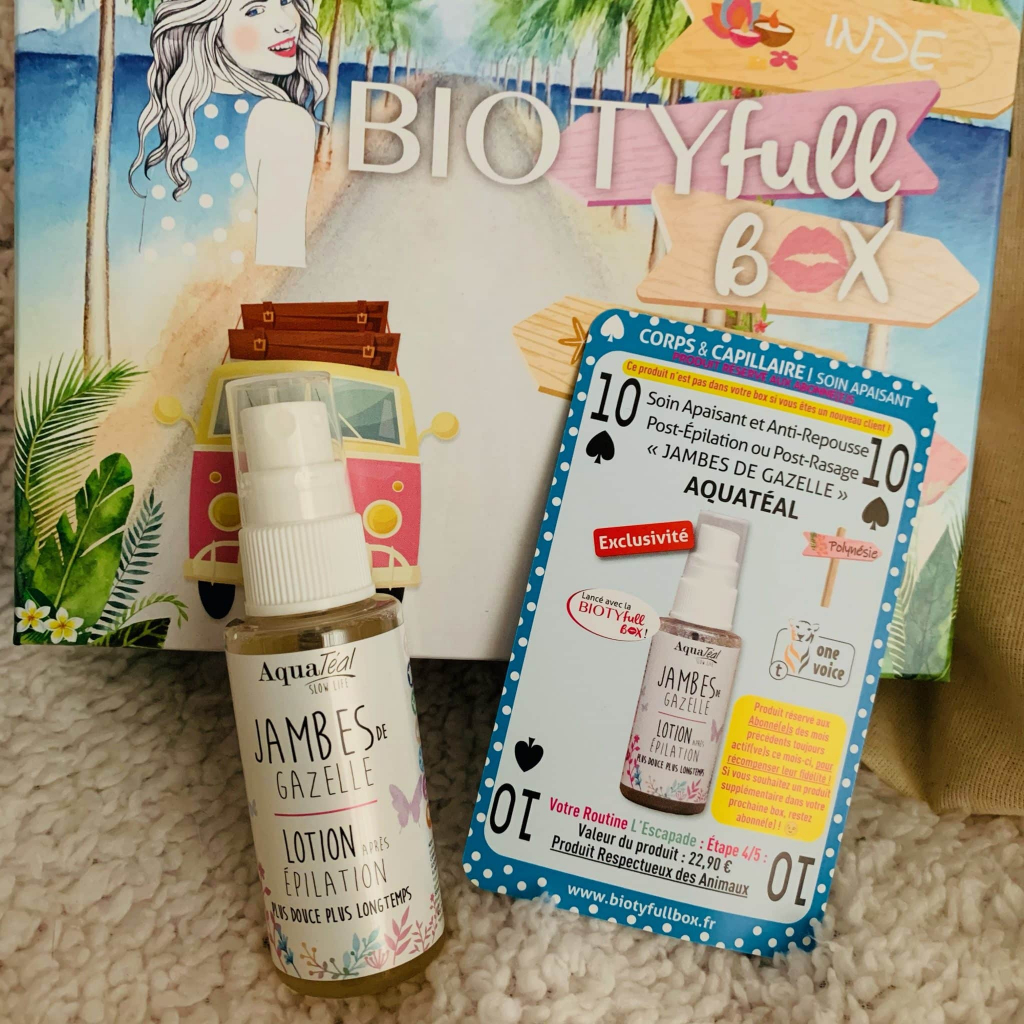 Etape 4, le soin offert pour les abonnées des mois précédents. Une lotion post épilation ou post rasage Jambe de Gazelle Aquatéal.