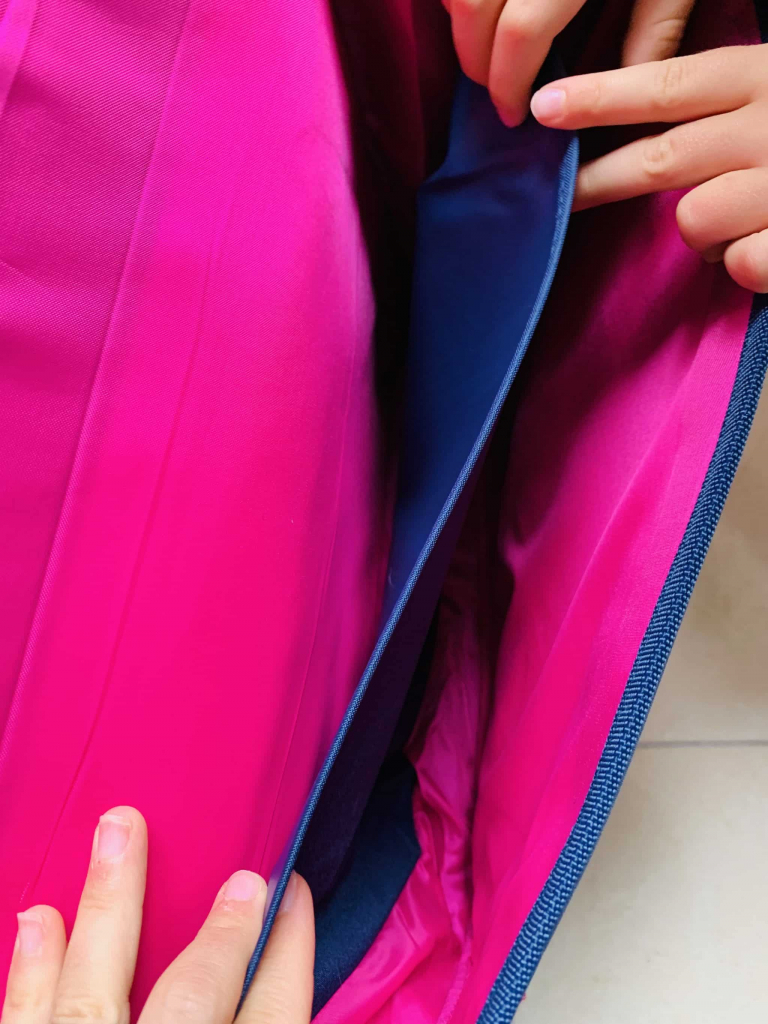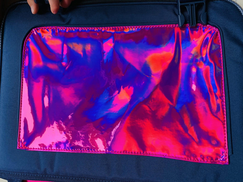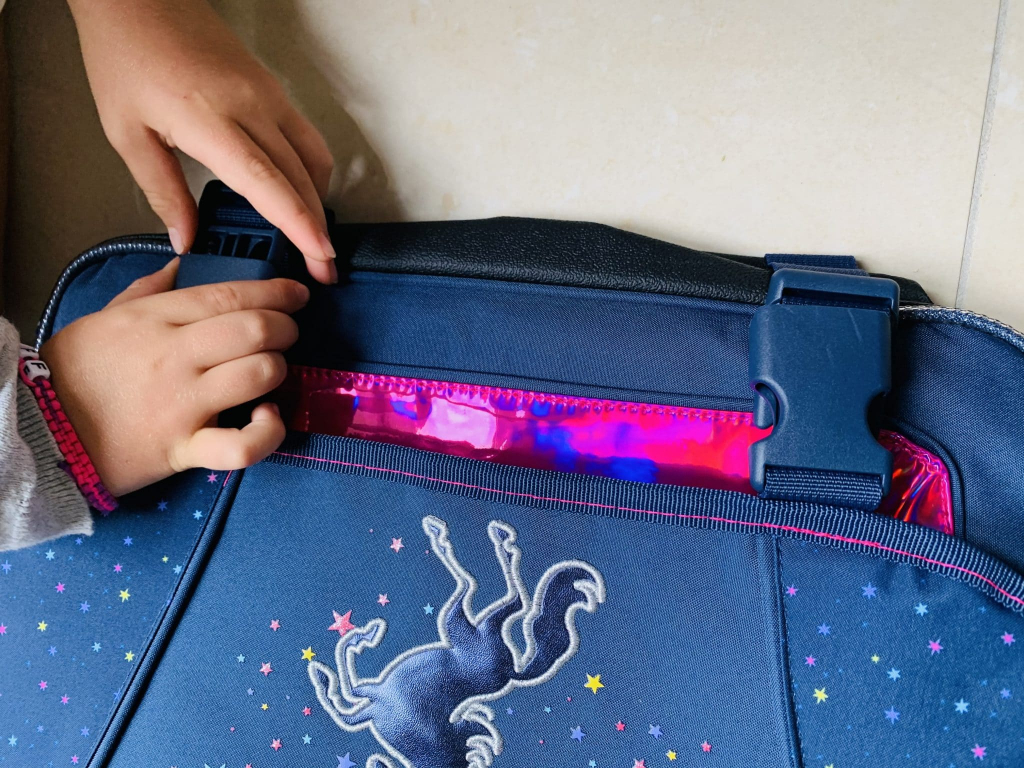 Je vais tenter de faire court car ça se constate sur les photos. Vous remarquez la grande bande visible holographique pour les voitures, les attaches faciles pour manipuler le cartable par un enfant de 6 ans. La jolie licorne étoilée pour ma girly adorée .