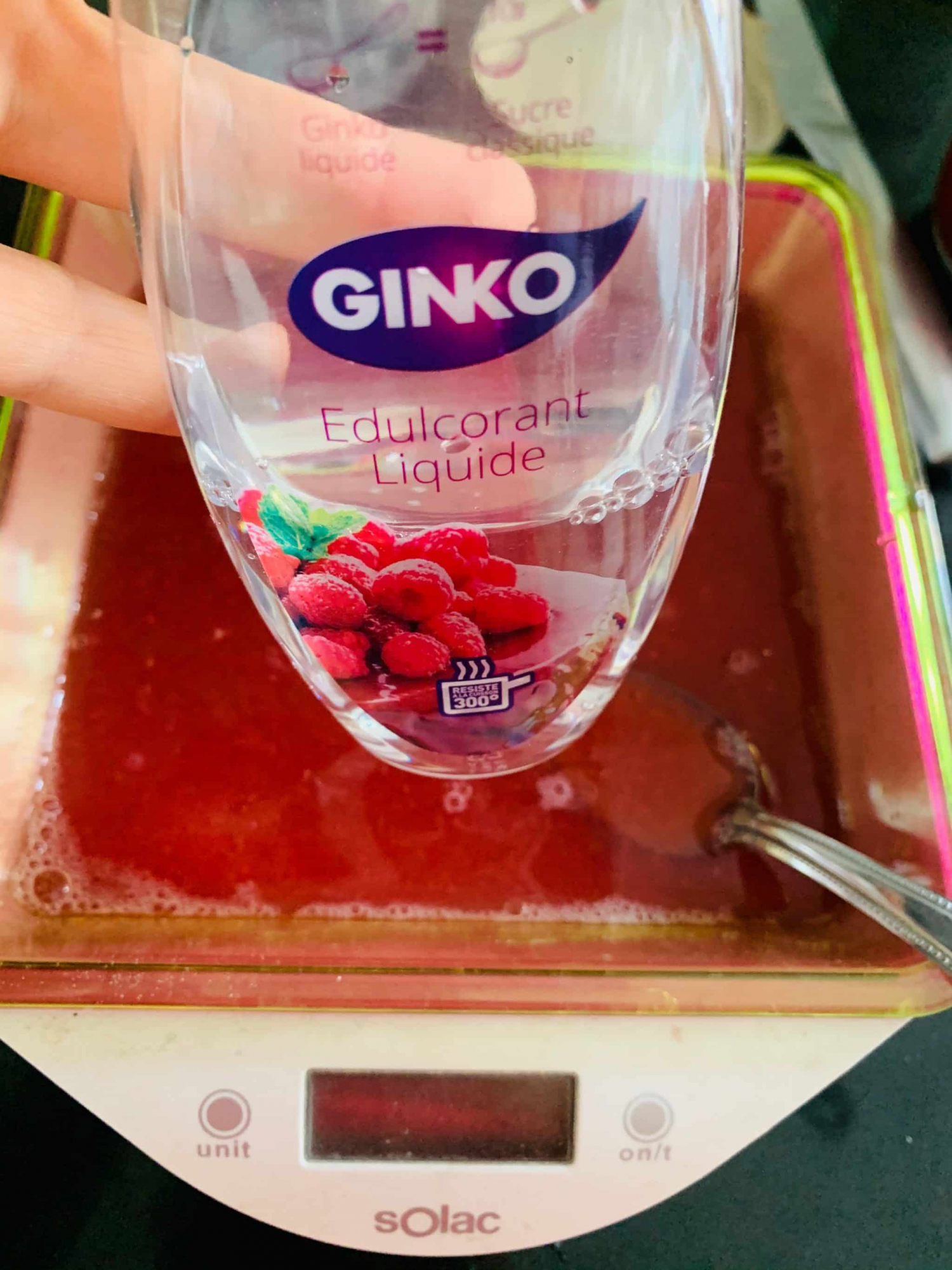 Deuxièmement, dans une casserole, mettez 150 grammes de jus de fruit, 25/30 grammes de gel de lin, , 3 cuillères à café d’édulcorant, et une cuillère a café d’agar agar.