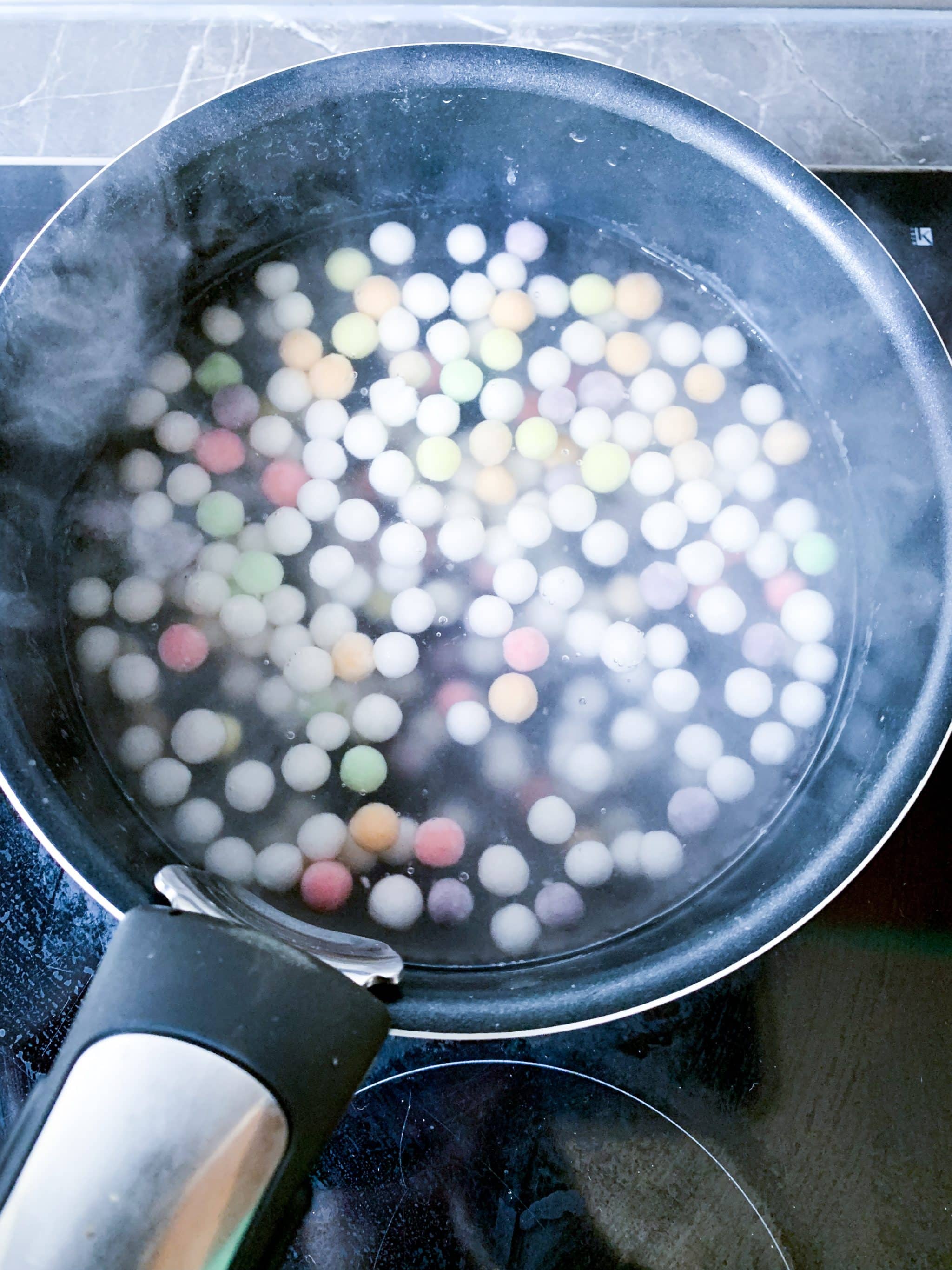 Conseil : Si vous vous êtes trompé(e)s dans la cuisson, ce qui m’est déjà arrivée. J’avais trop hâte de le réaliser … Vous pouvez les faire cuire de nouveau. Vous plongez dans l’eau bouillante et c’est parti, surtout ne jetez pas. Les perles de Tapioca qui ne sont pas assez cuites, c’est pas bon. N’hésitez pas a prolonger la cuisson de quelques minutes en surveillant, afin qu’elles soient moelleuses.
