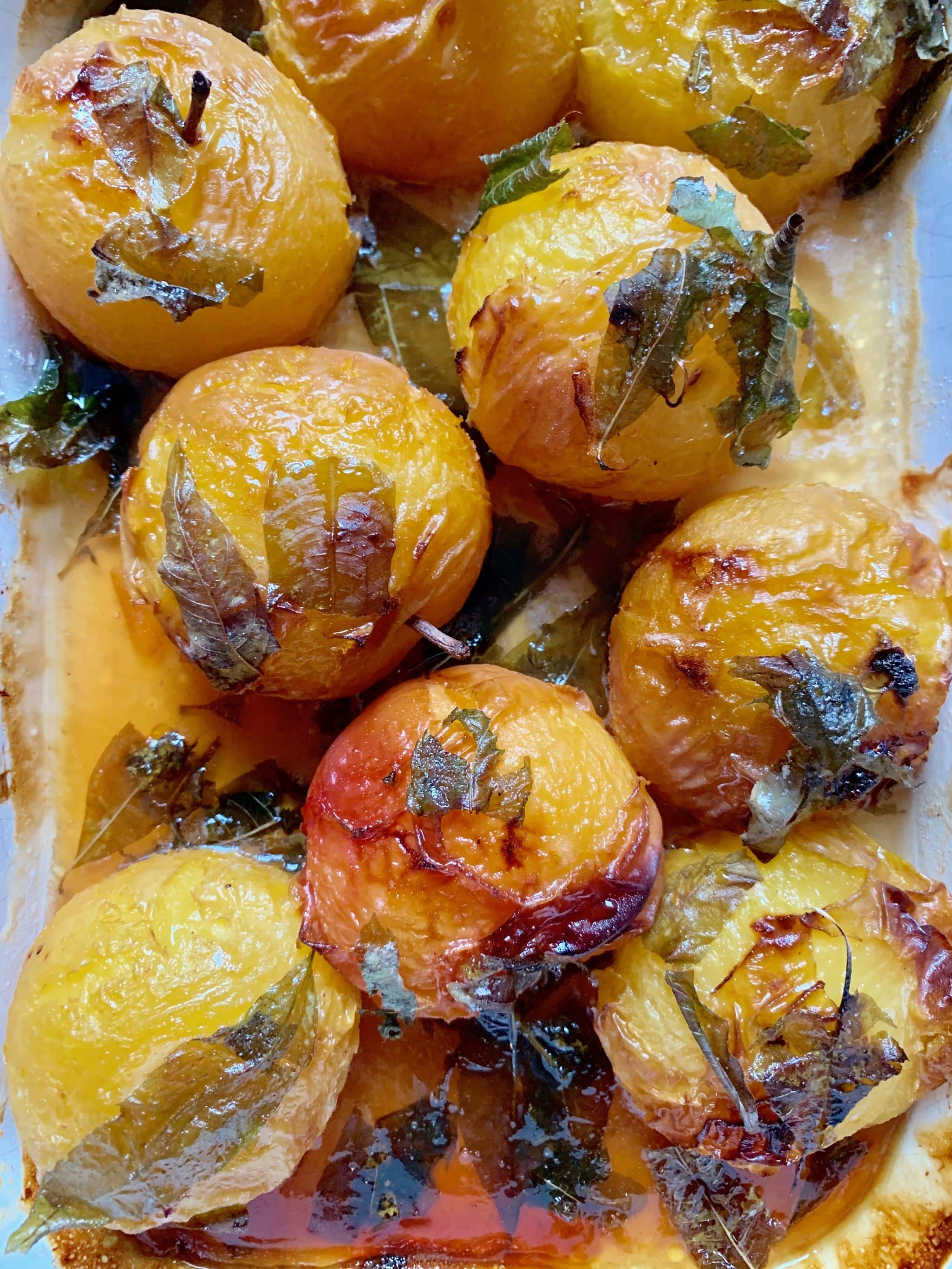 J’ai rincé les prunes, installées dans un plat qui va au four, un peu de miel sur chacune. Puis j’ai froissé de la verveine citronnée , un petit peu d’huile de coco encore solide et j’enfourne. C’est parti pour 30 minutes a 185/200 degrés .