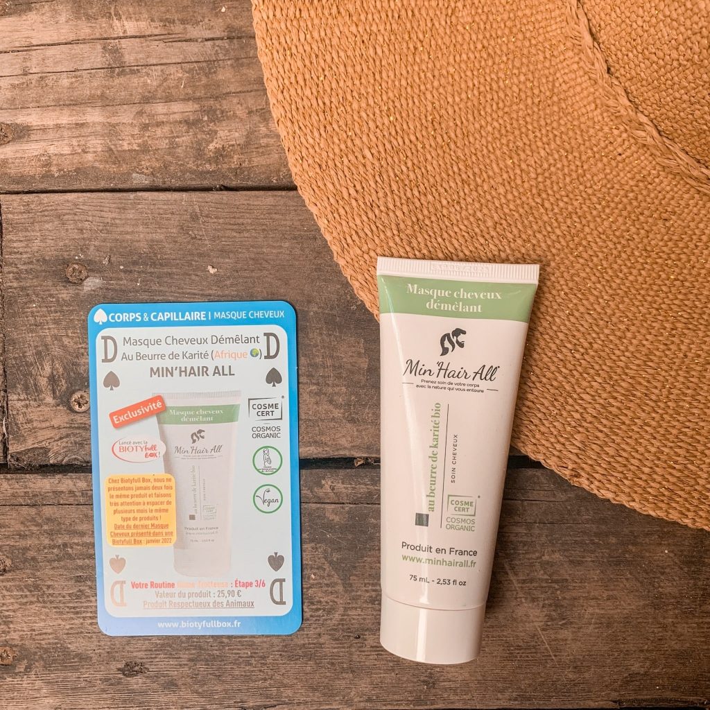 En petit trois, nous passons aux cheveux avec Min’hair all, un soin idéal pour la saison. Un masque pour les cheveux au beurre de karité et de l’huile végétale d’avocat. Un soin complet: une action démêlante, nourrissante, gainante, fortifiante et réparatrice.