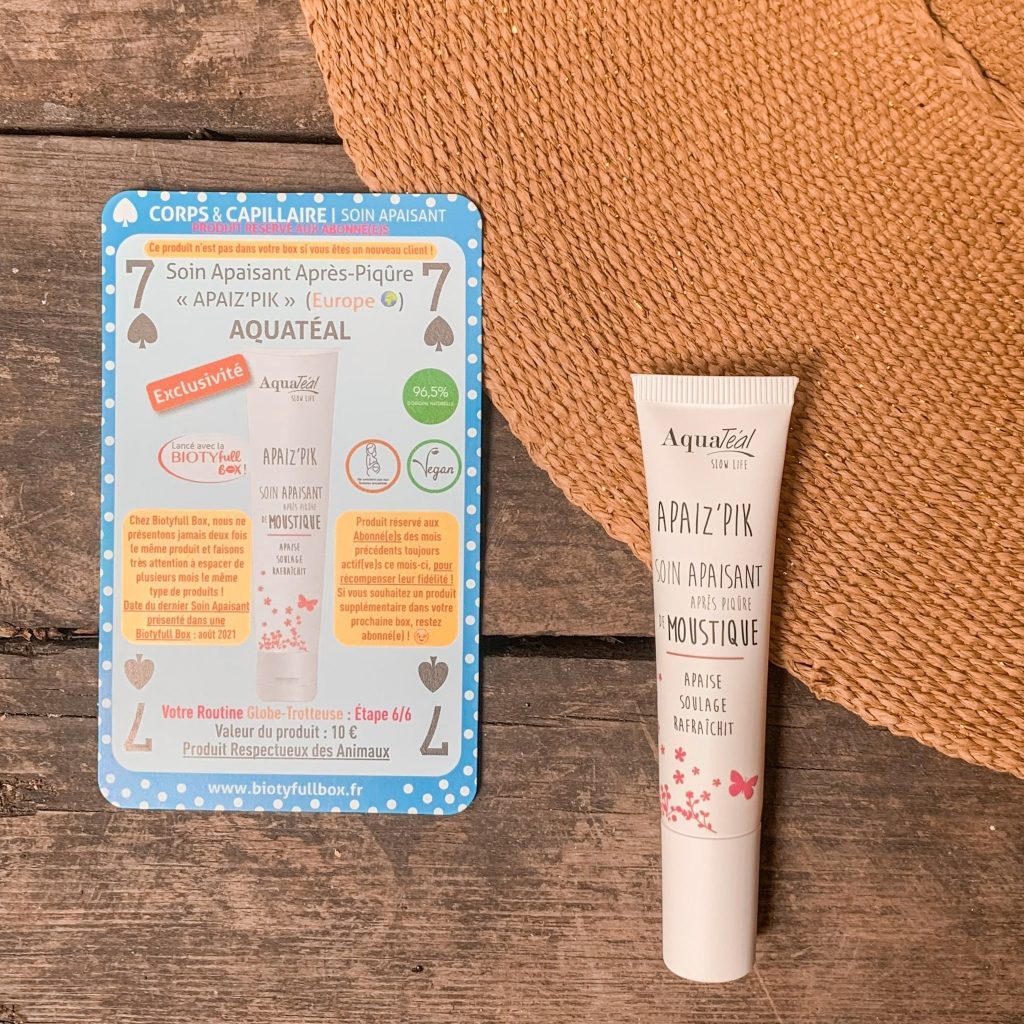 Le petit dernier, il s’agit du soin offert pour les abonnées des mois précédents. Une marque artisanale Aquatéal, c’est un soin apaisant après piqûres de moustiques. Le format se glisse dans un sac, une pochette, sa composition est canon, de l’huile essentielle de lavande aspic bio et de menthe poivrée bio, de l’allantoine végétale. Des vertus régénérantes, réparatrices, apaisantes et rafraichissantes.