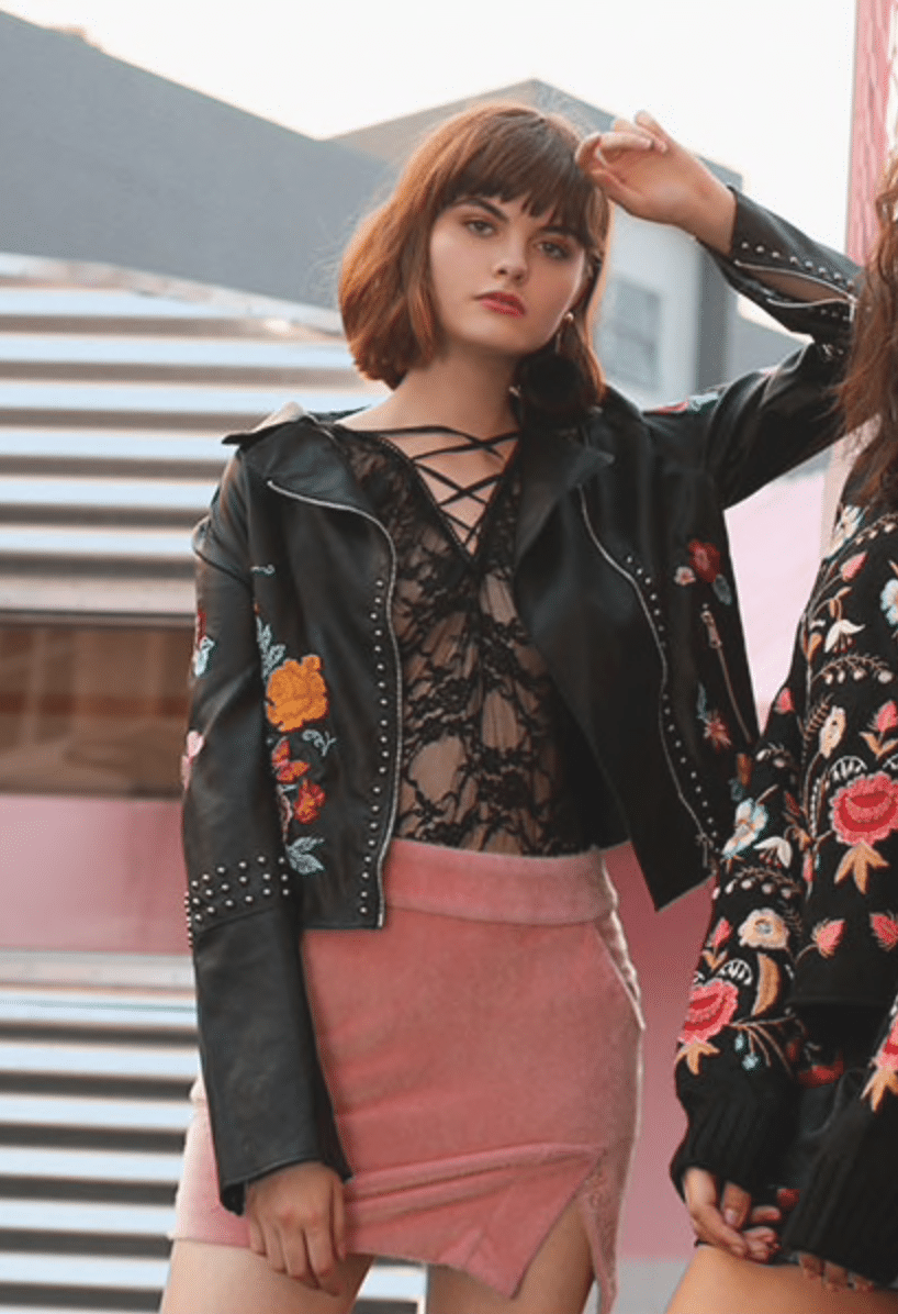 je commence par ce blouson en cuir brodé, il est beau. J’adore ce look.