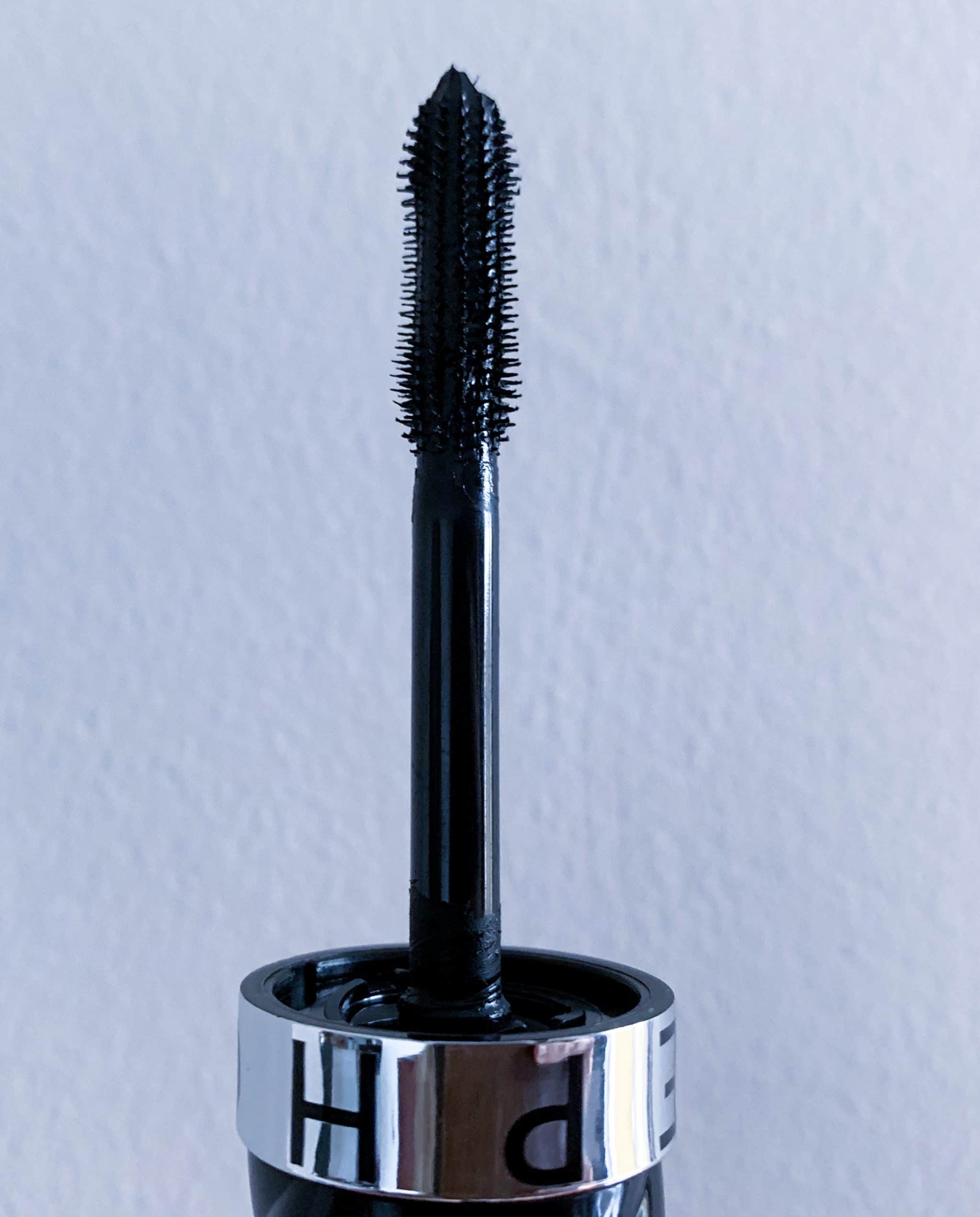 C’est un mascara doté d’une grosse brosse tout en courbe à la forme de sablier, il permet d’attraper tous les cils, de les séparer grâce à ses picots assez écartés et de les recouvrir d’une forme extra noire . La texture du mascara est couvrante, elle texturise les cils et les galbe grâce à sa brosse. La matière du mascara épaissie les cils et leurs donne un noir profond pour un effet volume XXL 3 D et sans paquet .