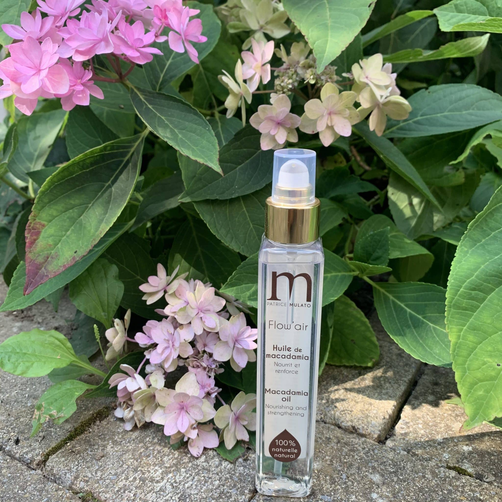Le soin Flow’air huile de macadamia Patrice Mulato, je l’applique sur mes pointes qui sont sensibilisées. J’ai un carré, mes cheveux frottent sur les vêtements, ils sont par ailleurs décolorés.